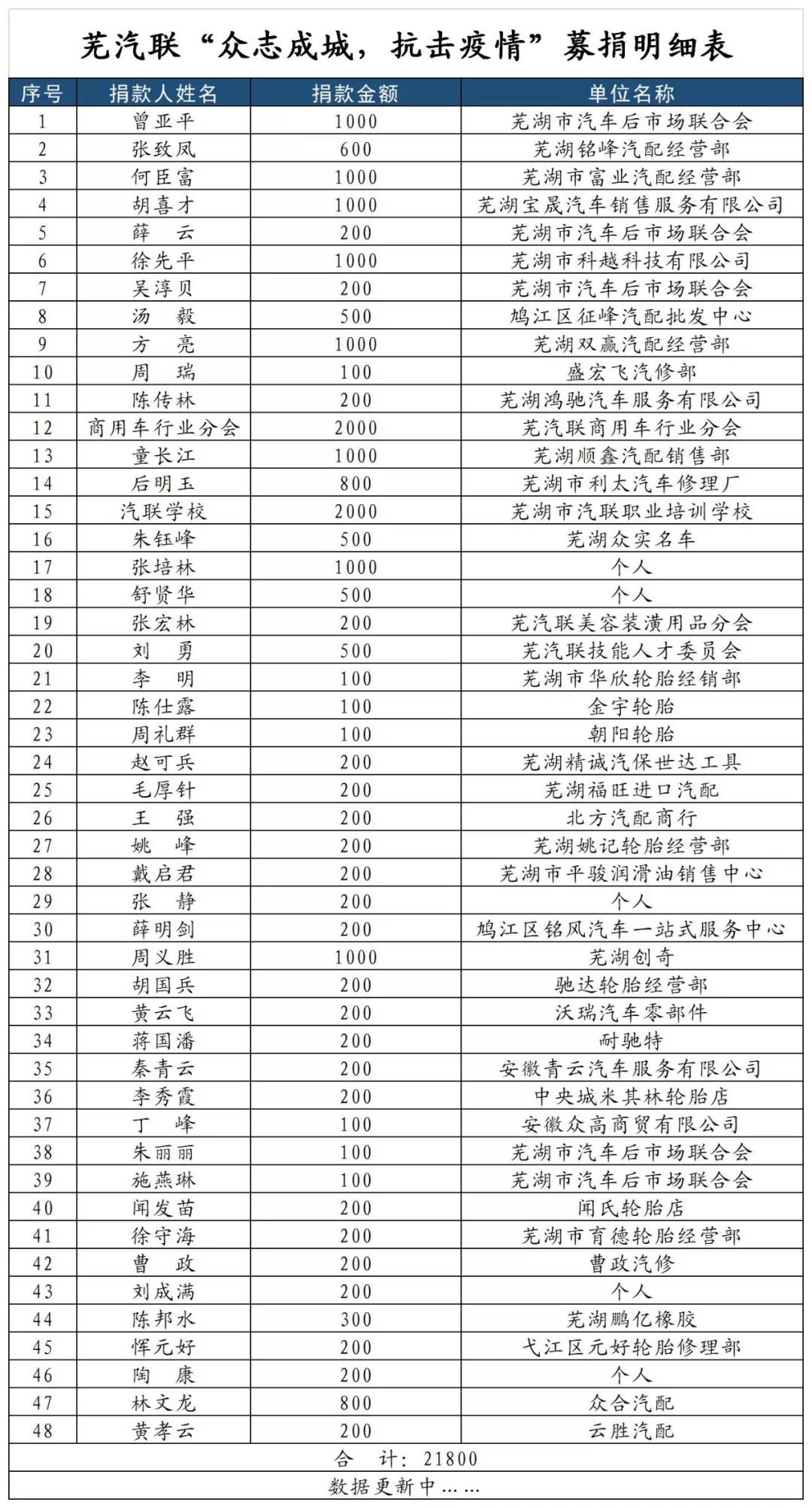 11、安徽蕪湖汽車后市場(chǎng)聯(lián)合會(huì)會(huì)長(zhǎng)曾亞平 捐款1000元