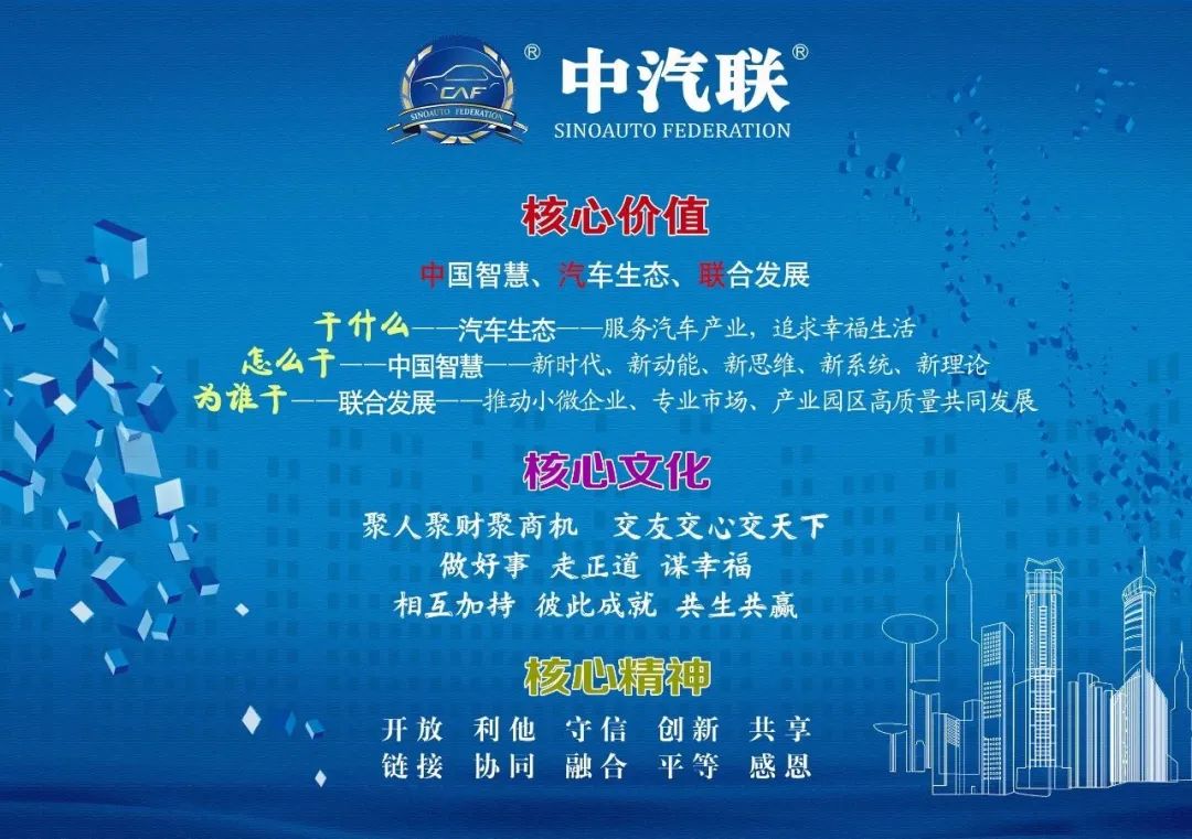中汽聯在創新的道路上不斷探索,成功過、失敗過、徘徊過、猶豫過,為緊跟國家步伐,筑夢美好生活,中汽聯毅然投身汽車生態幸福賽道,按照“做好事、走正道、謀幸福”的中汽聯理念,遵循“專業、積極、智慧、共贏”的中汽聯行為準則,按照“利他、創新、共享、鏈接、協同、融合”的中汽聯核心精神,把“為汽車人對美好生活的向往獻智力、增活力、添動力、聚合力”定義為中汽聯的終極目標,全力打造具有共同價值觀、以推動汽車產業高質量發展為神圣使命的企業家創新共生平臺。
