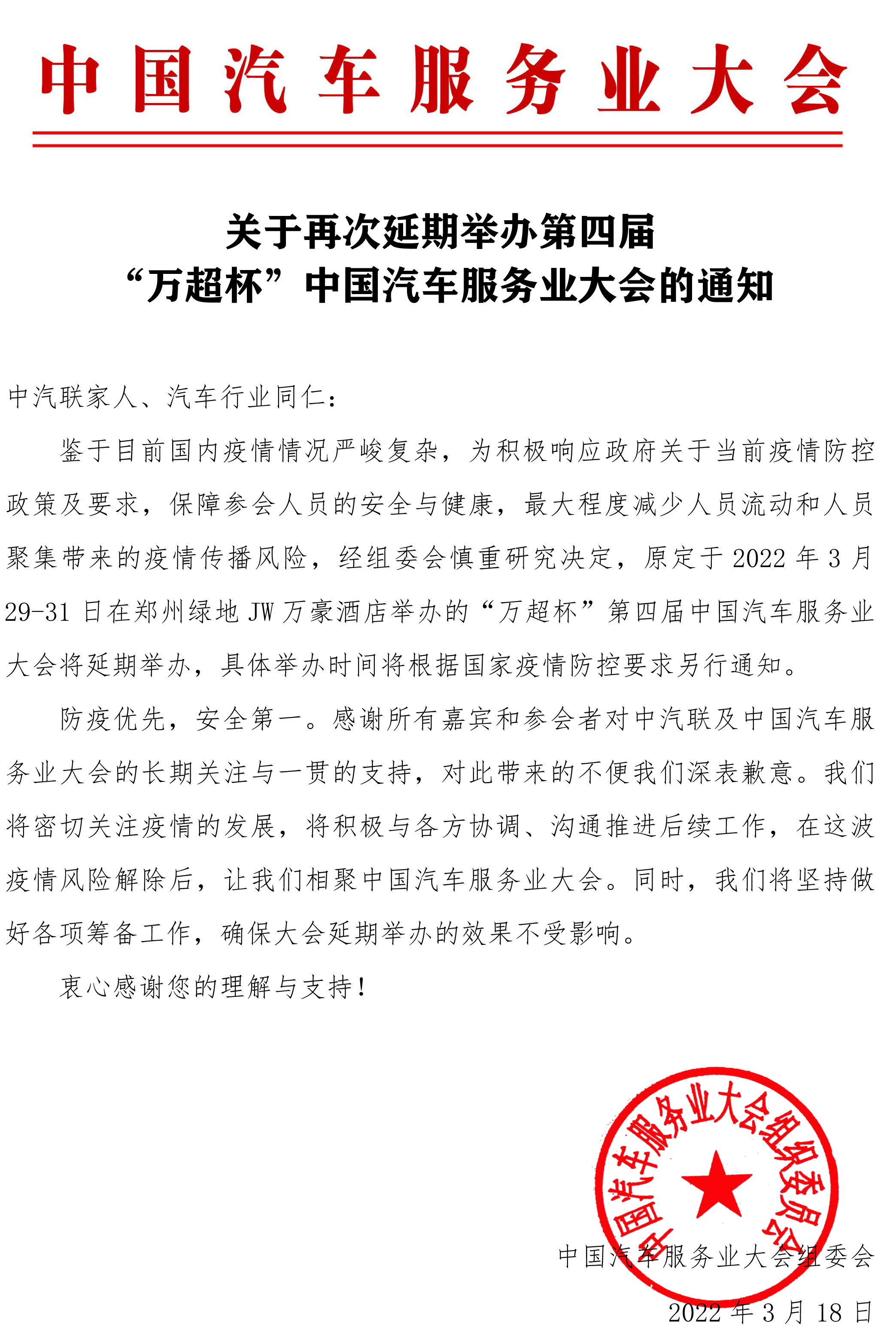 鑒于目前國內疫情情況嚴峻復雜,為積極響應政府關于當前疫情防控政策及要求,保障參會人員的安全與健康,最大程度減少人員流動和人員聚集帶來的疫情傳播風險,經組委會慎重研究決定,原定于2022年3月29-31日在鄭州綠地JW萬豪酒店舉辦的“萬超杯”第四屆中國汽車服務業大會將延期舉辦,具體舉辦時間將根據國家疫情防控要求另行通知。