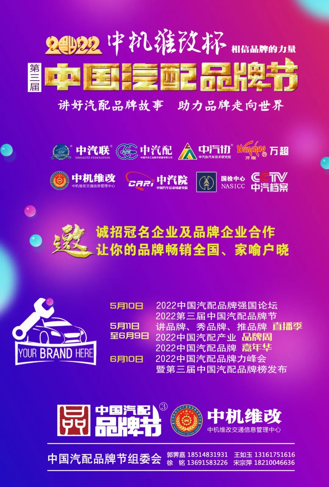 為響應國家品牌強國戰略,宣傳推介汽配行業名優品牌,2022年5月10日-6月10日,中汽聯將聯合中汽配、中汽協、中機交管、萬超等機構在總結以往取得的經驗和積累的成果的基礎上,繼續舉辦“2022年中機維改杯第三屆中國汽配品牌節”系列活動,誠邀廣大汽配企業、主機廠及科研機構等有關單位踴躍參加,展示汽配品牌企業在抗疫及復工復產中的榜樣擔當,為品牌強國建設貢獻行業力量,共襄盛事。