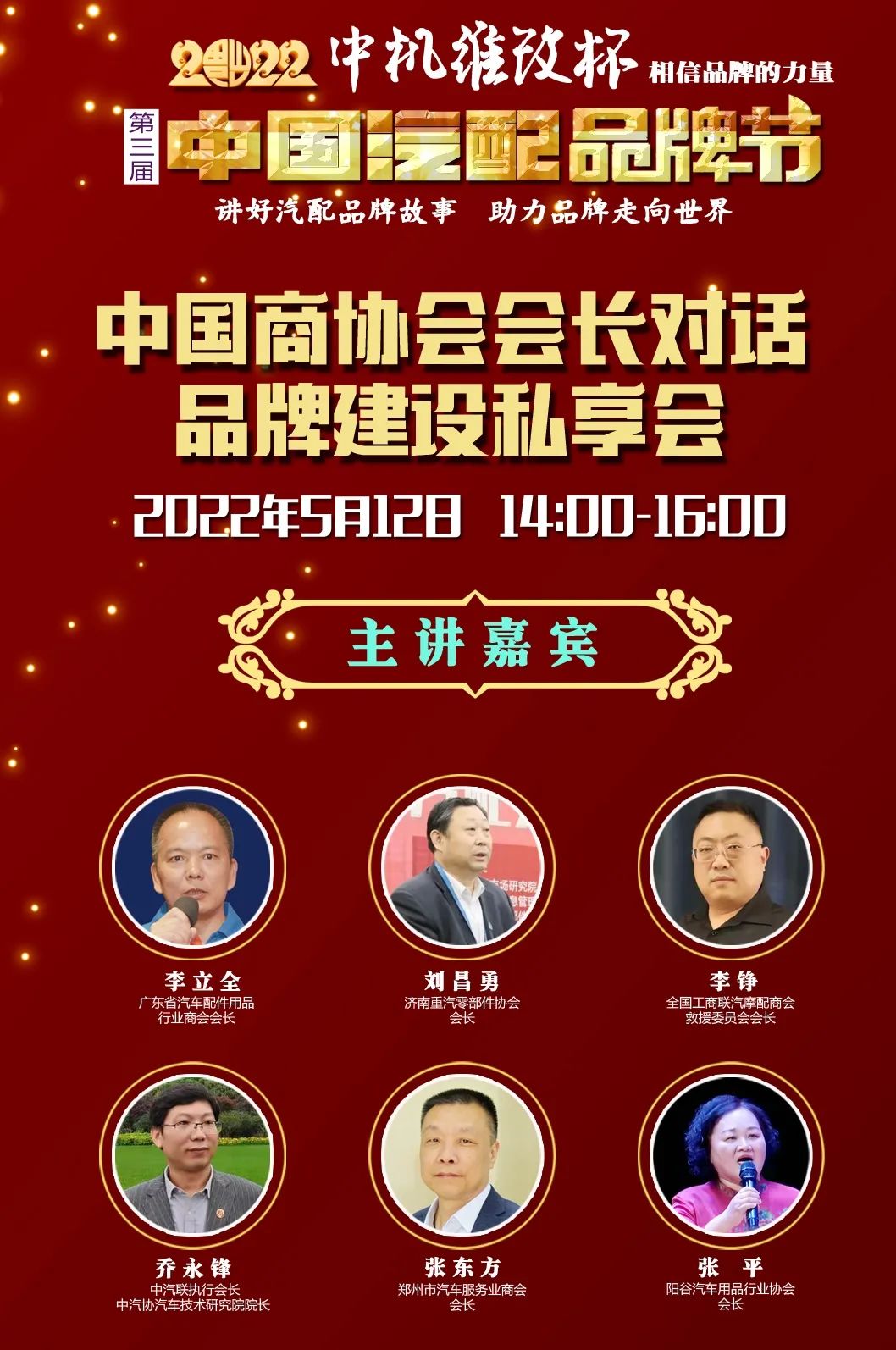 中國商協會會長對話品牌建設私享會是2022中機維改杯第三屆中國汽配品牌節系列活動的第二場,由中汽聯、中汽配、中機維改共同主辦;哈爾濱宏博達汽車配件有限公司、上海萬超汽車天窗有限公司、黑龍江福斯途汽車服務有限公司、包頭市順風燃油催化器制造有限責任公司、霸州市華善新能源科技有限公司聯合主辦;由中國(陽谷)車品小鎮、華勝集團、上海燎申集團、吉林欣瑞邦汽車有限責任公司、安徽英克爾汽車零部件有限公司、北京長宏企鵝助劑有限公司友情協辦;由吉林優佳特新能源科技有限公司、上海京滬投資管理有限公司、青州軍輝駐車新能源有限公司、山東科佳智能裝備城、鄭州尊生汽車零部件制造有限公司、滄州環銳精密鑄造有限公司、遼寧浩億達科技有限公司、河南頤爾福新能源科技有限公司特別支持;邯鄲市達維汽車維修有限公司、沈陽樂達汽車服務有限公司、黑龍江省海濤汽車銷售服務有限公司、哈爾濱玉鑫兄弟科技有限公司、滄州守諾金屬制品有限公司友情贊助;由德州市鑫雙恒汽車服務有限公司、浚縣李春亮汽車維修門市部、滄州春立汽車服務有限公司、臨沂富裕汽車服務有限公司、綏中縣宏騰汽車服務有限公司、榆樹市鑫運程汽車服務限公司、綏中縣鑫發汽車服務有限公司、臨清市浩航汽車服務有限公司特別祝賀。