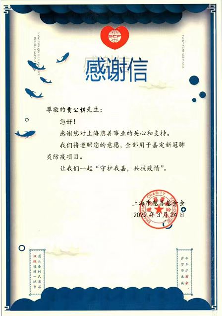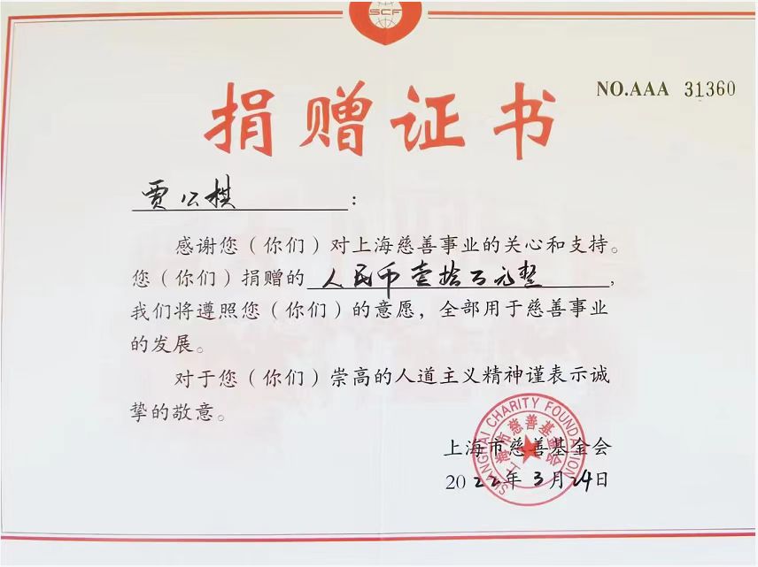 近日來,全國疫情形勢復雜,社會各界全力以赴,眾志成城,科學有序地持續開展新冠肺炎疫情聯防聯控工作,打響了一場勇毅而溫情的抗議防控狙擊戰。為了更好的弘揚社會風氣和正能量,大力宣傳我國一方有難,八方支援的優良傳統文化,充分發揮企業家精神,2022年3月,賈公棋向溫州捐款10萬元人民幣,向上海市慈善基金會捐贈10萬元整用于前線醫護人員,公安干警,抗疫自愿者的慰問和助力新冠肺炎防疫項目。
