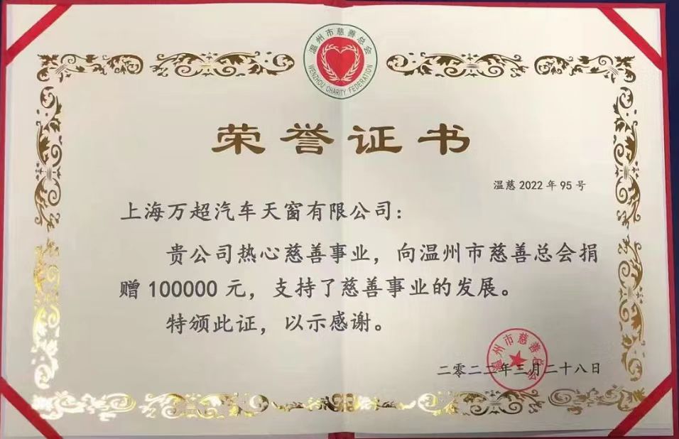 在溫州市乃至整個長三角,全國知名企業家賈公棋堅守初心、誠信仁義、樂善好施的故事,已傳為佳話,成為中國汽車零部件行業的傳奇人物。誠信更是他的一個標簽,誠信是萬超致力于打造汽車天窗行業標桿的初心,是永恒追求“不是優質產品不出,不是匠心產品不產”的恒心,更是用心做好每一個產品的匠心。