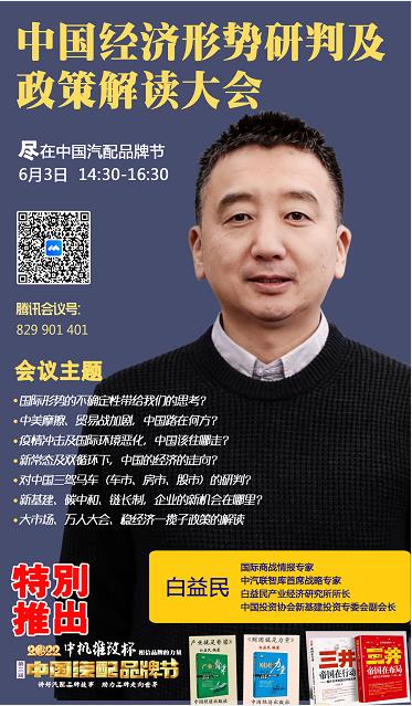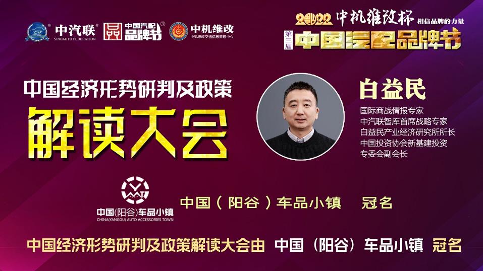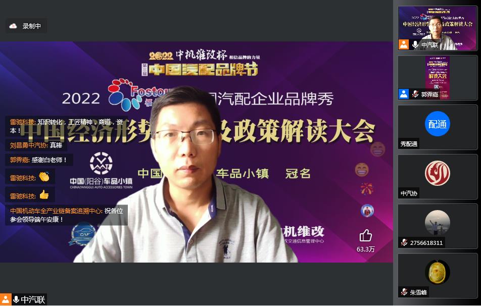 2022年6月3日,“2022 福斯途杯 中國汽配企業品牌秀”的第五場活動,由 中國(陽谷)車品小鎮 特約冠名播出的2022中國經濟形勢研判及政策解讀大會在線上成功舉行,中汽聯智庫首席戰略專家、中國戰略經濟學家、中國產業經濟學家、國際商戰情報專家白益民 出席中國經濟形勢研判及政策解讀大會并做了精彩分享,引起了社會的廣泛關注,點贊數量達到64萬個。2022中國經濟形勢研判及政策解讀大會由中汽聯執行會長、中汽協汽車技術研究院院長喬永鋒主持。