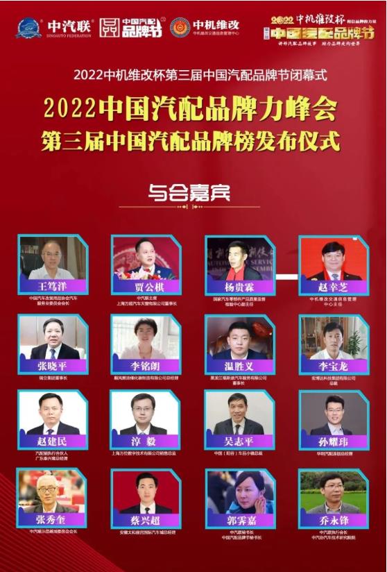 2022年6月10日,為期一個月的2022中機維改杯第三屆中國汽配品牌節圓滿落幕,中國汽車服務業委員會會長、中國汽車工業配件銷售有限公司原董事長王篤洋,中汽聯主席、上海萬超汽車天窗有限公司董事長賈公棋,國家汽車零部件產品質量監督檢驗中心副主任、中汽環球汽配用品檢測認證中心主任楊貴霖,浙江省汽摩配商會會長、瑞立集團董事長張曉平等領導和嘉賓出席閉幕式——“2022中國汽配品牌力峰會暨第三屆中國汽配品牌榜發布儀式”,引起了行業的廣泛關注,點贊數量達到124.2萬個。閉幕式由中汽聯執行會長、中汽協汽車技術研究院院長喬永鋒主持。