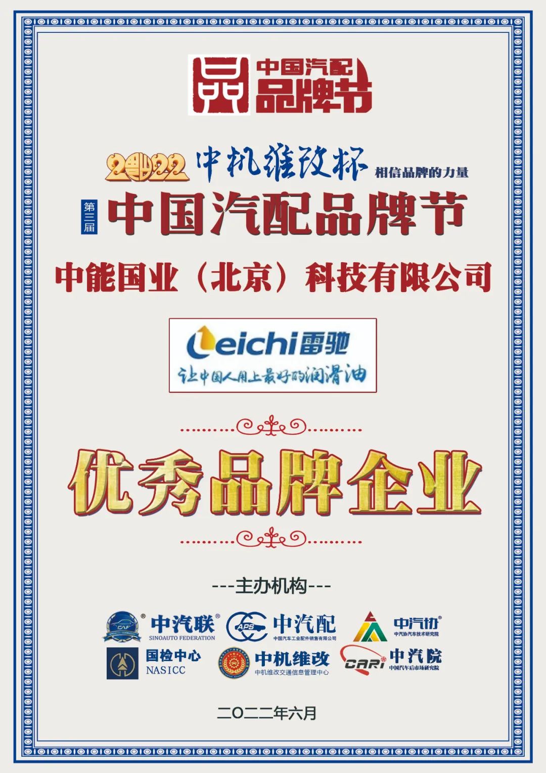 中能國業(北京)科技有限公司是一家軍創企業,秉承軍人的優良傳統,以科技興國、實業興邦的理念,傳承誠信、擔當和愛國主義,卓立發展普及中國汽車后市場科技領域的高科技企業。采用自主領先突破性科技成果,使旗下雷馳潤滑油、雷馳勁爽等核心性能超越世界一流品牌技術品質。打造中國制造與中國智造!