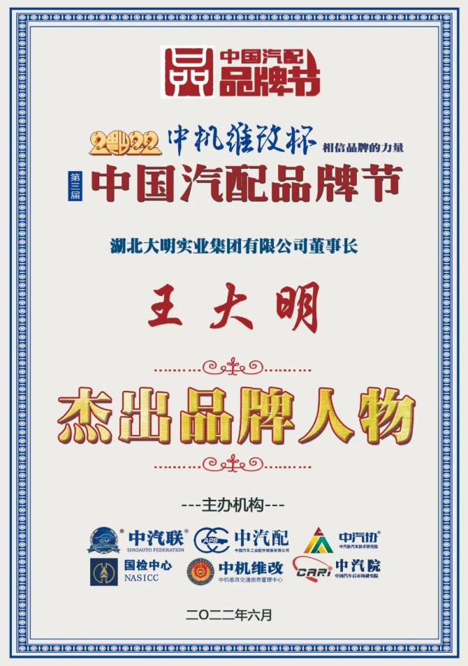 據《2022中國汽配品牌榜》榜單顯示:大明實業董事長王大明榮膺“2022中國汽配行業杰出品牌人物”、中國(十堰)汽配城榮膺“2022中國汽配行業杰出品牌園區”兩項大獎。