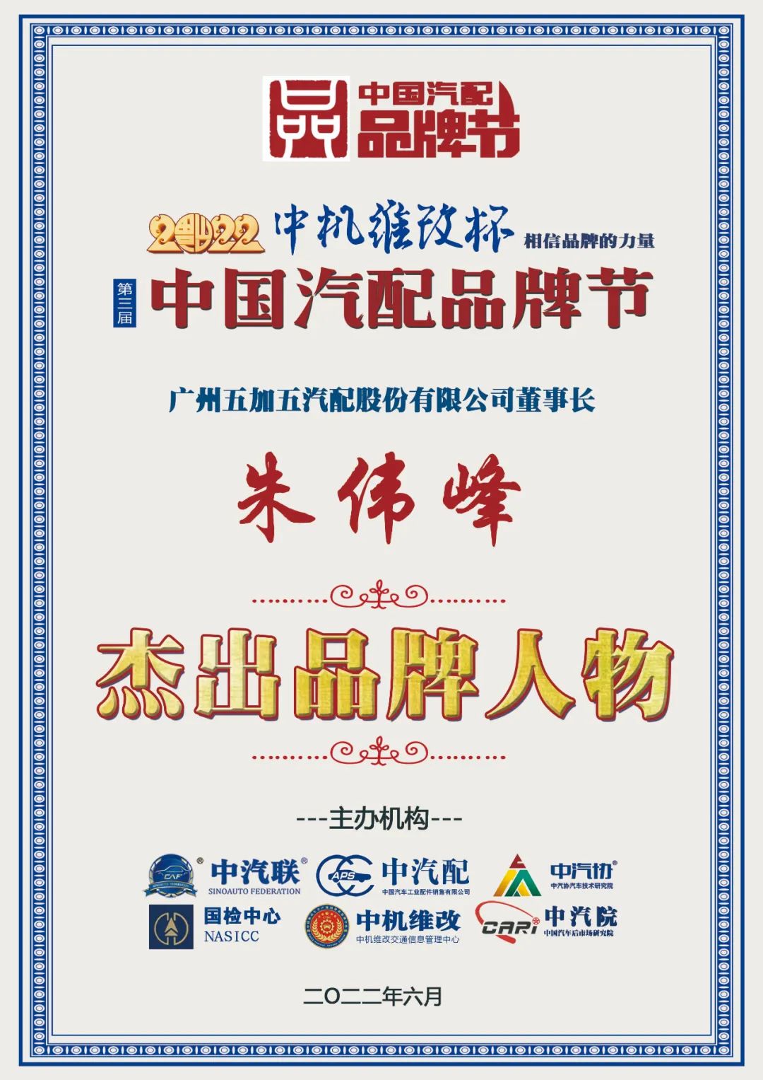 據《2022中國汽配品牌榜》榜單顯示:廣州五加五汽配股份有限公司董事長朱偉峰榮膺“2022中國汽配行業杰出品牌人物大獎。