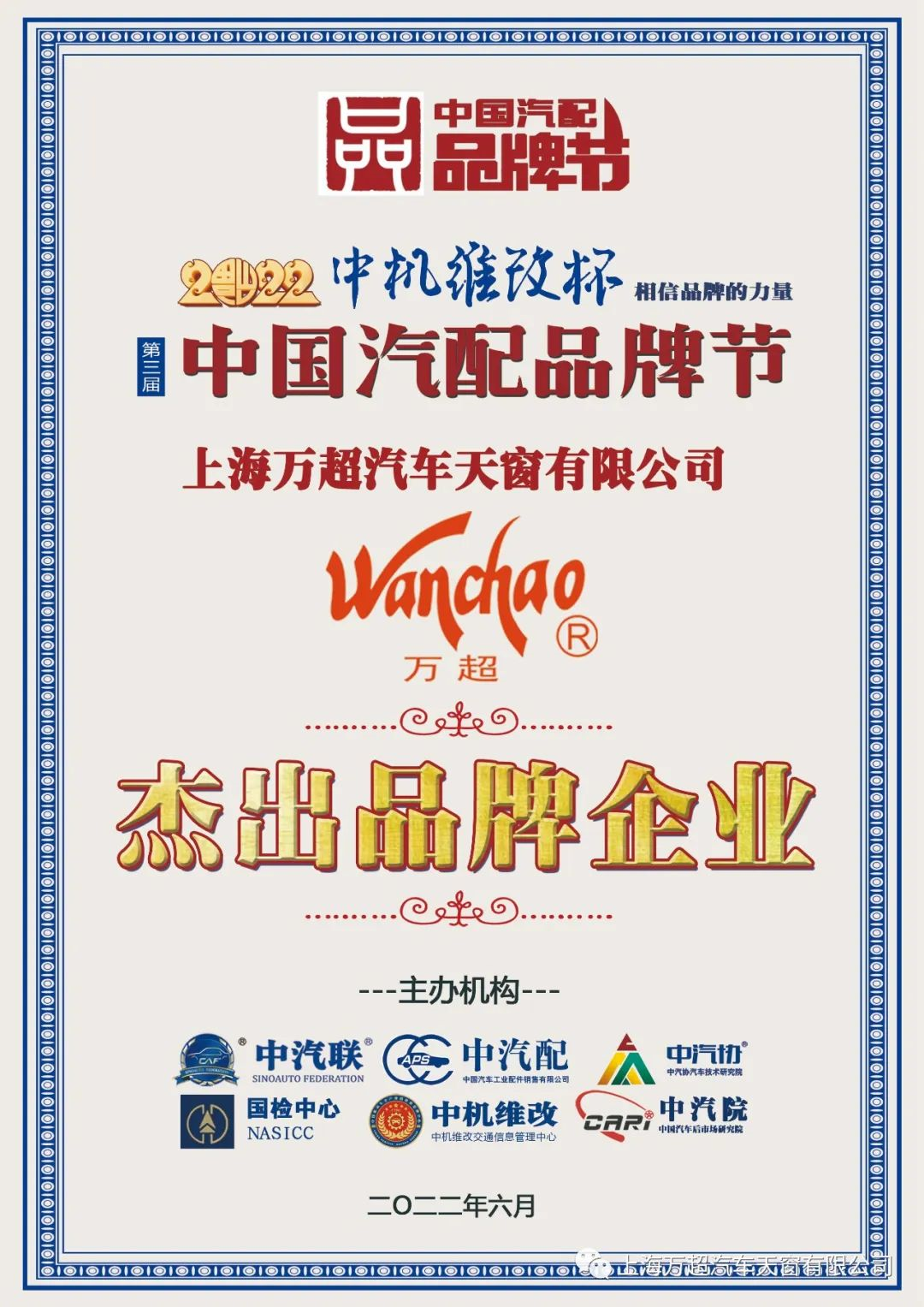 據《2022中國汽配品牌榜》榜單顯示:上海萬超汽車天窗有限公司董事長賈公棋榮膺“2022中國汽配行業杰出品牌人物”、萬超榮膺“中國汽配行業杰出品牌企業”兩項大獎