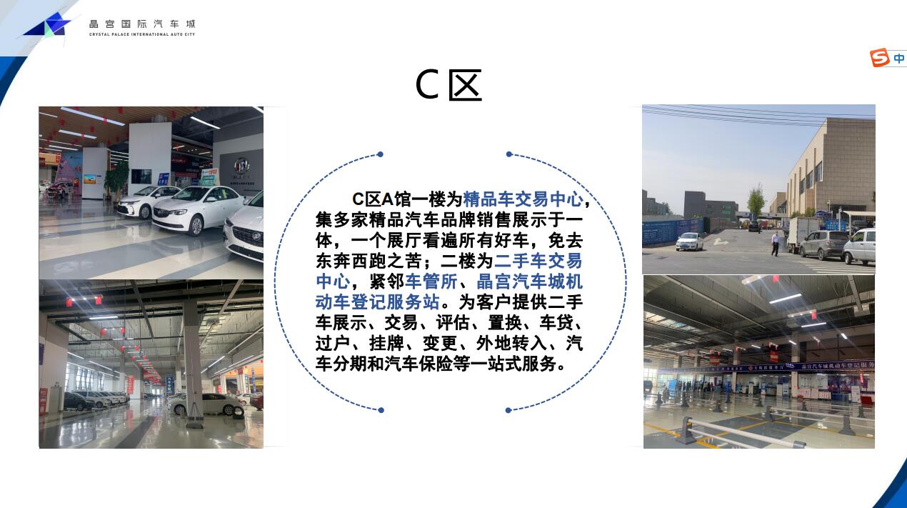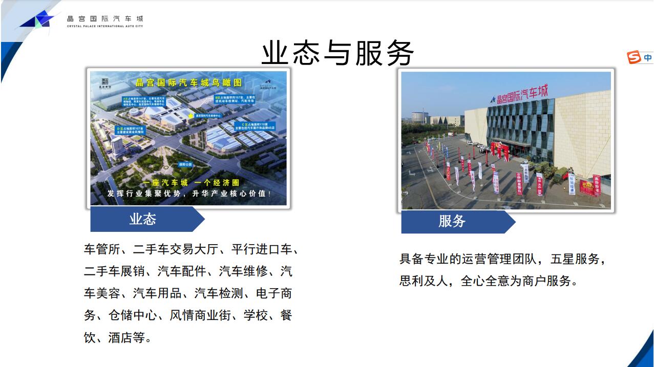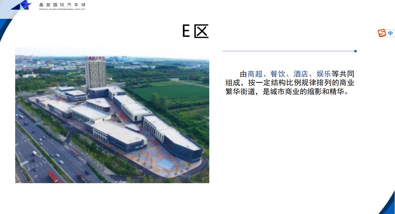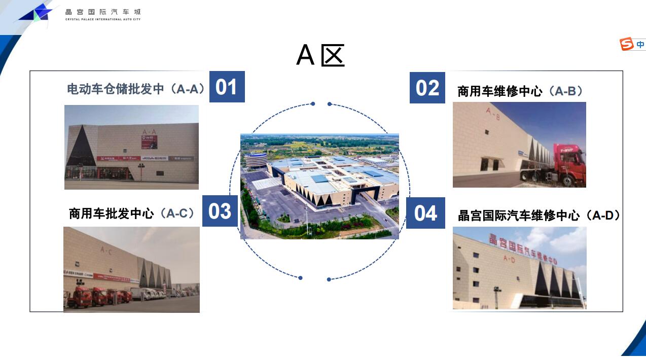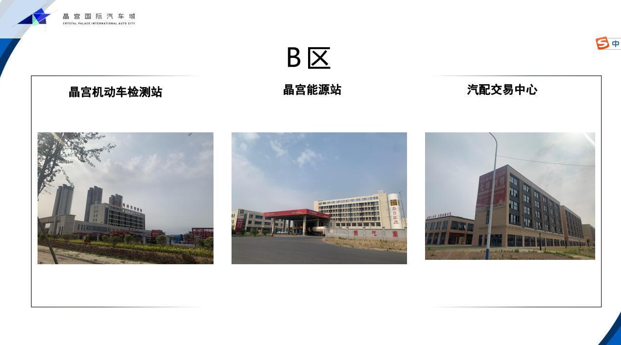 晶宮國際汽車城由A、B、C、D、E五個區組成,分為三期進行開發 運營。A區占地面積約147畝,總建筑面積約12萬方,由汽車科技博物館、 商用車批發中心、晶宮國際汽車維修中心、晶宮電動車批發倉儲中 心、快運物流中心、倉儲中心組成; B區一期主要由晶宮機動車檢測站和晶宮能源組成;二期約7.3萬方汽 車配件專業市場; C區占地面積約1 10畝,建筑面積約7.5萬方,由約3.2萬方精品汽車 展廳和約4.3萬方汽車4S店區域組成; D區占地面積約60畝,建筑面積約5萬方,由2萬方汽車4S店和3萬 方汽車商業辦公組成; E區占地面積約78畝,建筑面積約8.6萬方,主要由星級酒店和風情 商業街組成。