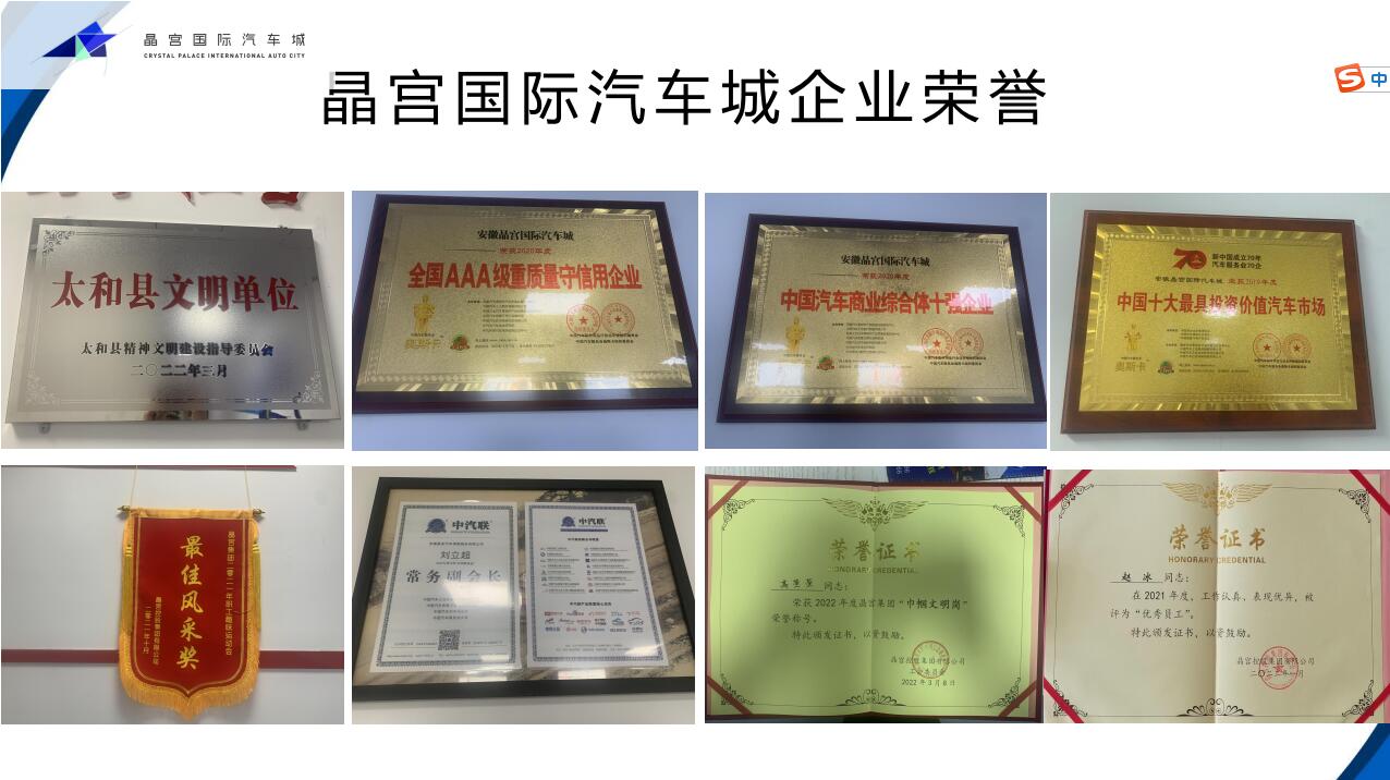 晶宮國際汽車城的企業文化:一個目標:三年內完成對周邊一百公里核心輻射, 比肩國內一類汽車專業市場,讓太和人民買 車、賣車、修車、養車站式。運營理念:五星服務 思利及人 四點指導:1在工作的時間工作的地點、工作的場 合,任何時候都要以維護公司利益為己任; 2、勇于擔當,敢于擔責;3、忠誠,忠子職守、精益求精。認真 生活,快樂工作。