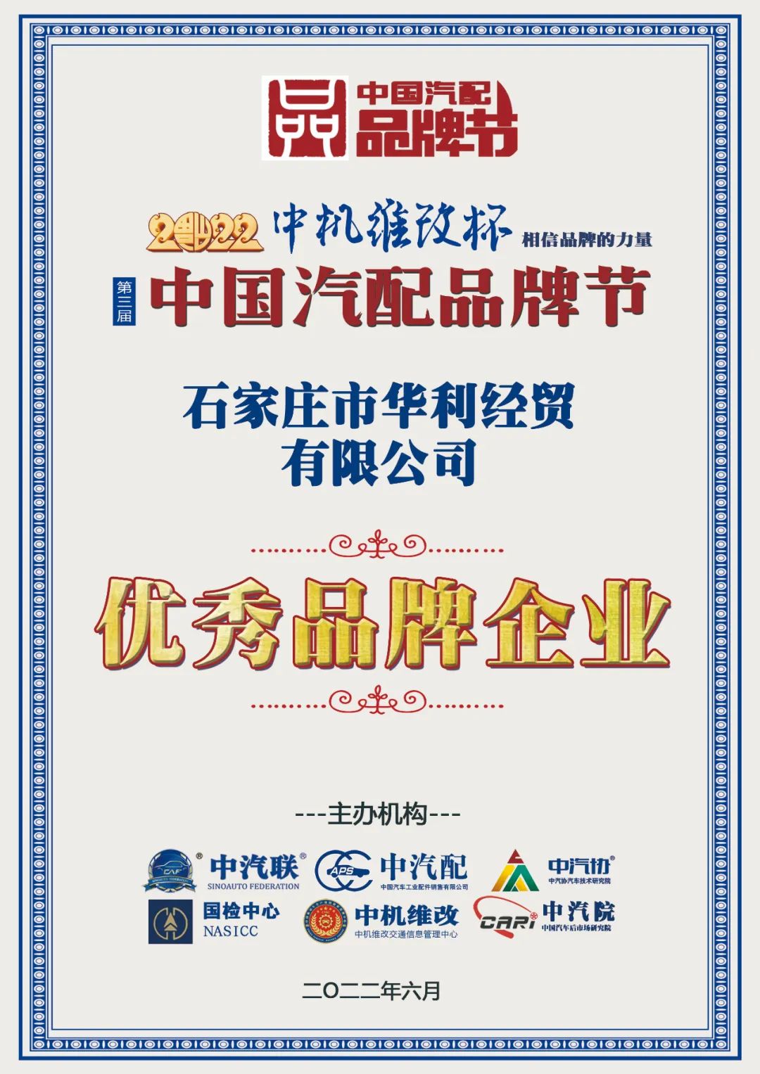 據《2022中國汽配品牌榜》榜單顯示:石家莊市華利經貿有限公司榮膺“2022中國汽配行業優秀品牌企業”大獎。