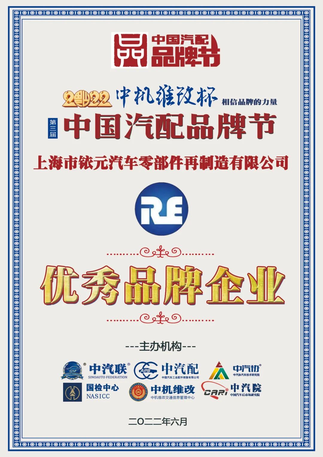 據《2022中國汽配品牌榜》榜單顯示: 上海市銥元汽車零部件再制造有限公司榮膺“2022中國汽配行業(yè)優(yōu)秀品牌企業(yè)”大獎。