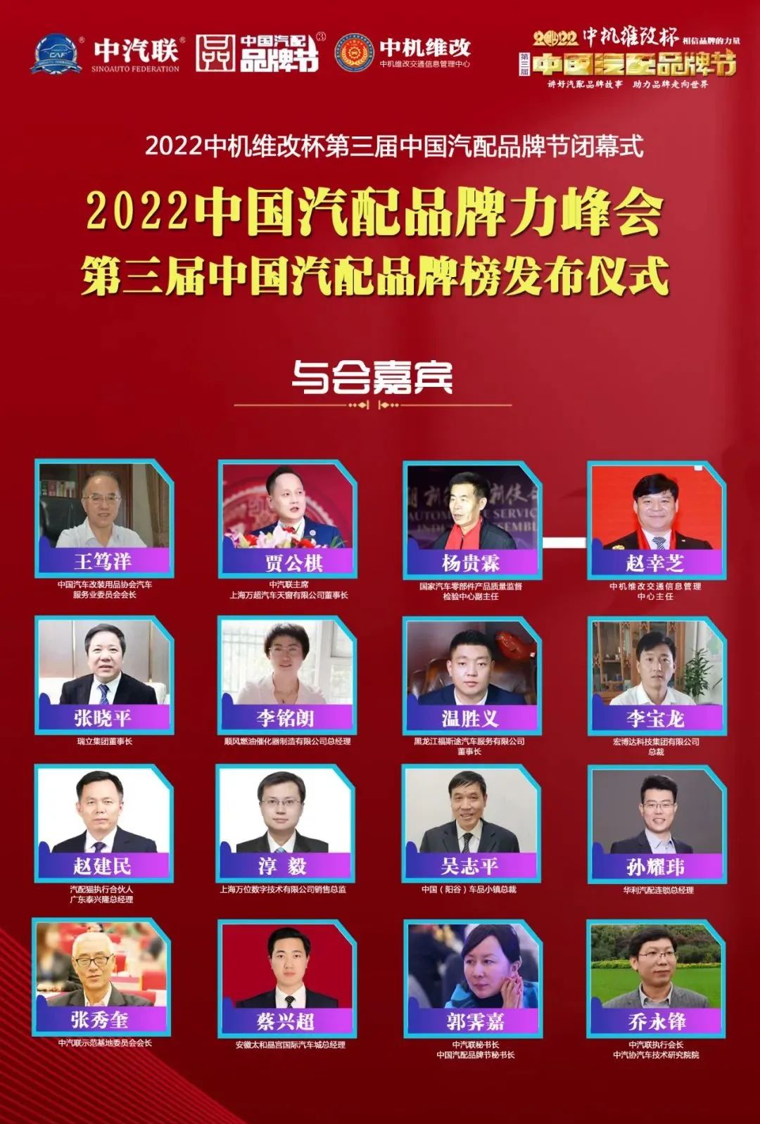 限公司董事長賈公棋,國家汽車零部件產品質量監(jiān)督檢驗中心副主任、中汽環(huán)球汽配用品檢測認證中心主任楊貴霖,浙江省汽摩配商會會長、瑞立集團董事長張曉平等領導和嘉賓出席閉幕式——“2022中國汽配品牌力峰會暨第三屆中國汽配品牌榜發(fā)布儀式”,引起了行業(yè)的廣泛關注,點贊數量達到124.2萬個。閉幕式由中汽聯執(zhí)行會長、中汽協(xié)汽車技術研究院院長喬永鋒主持。