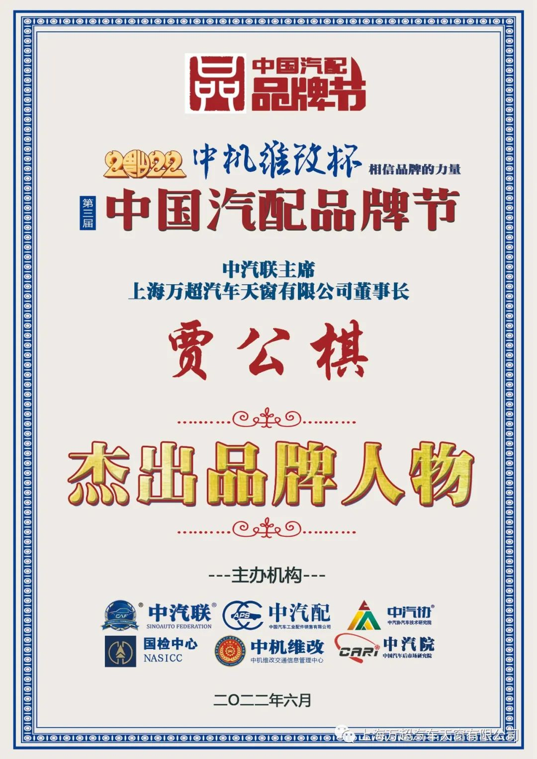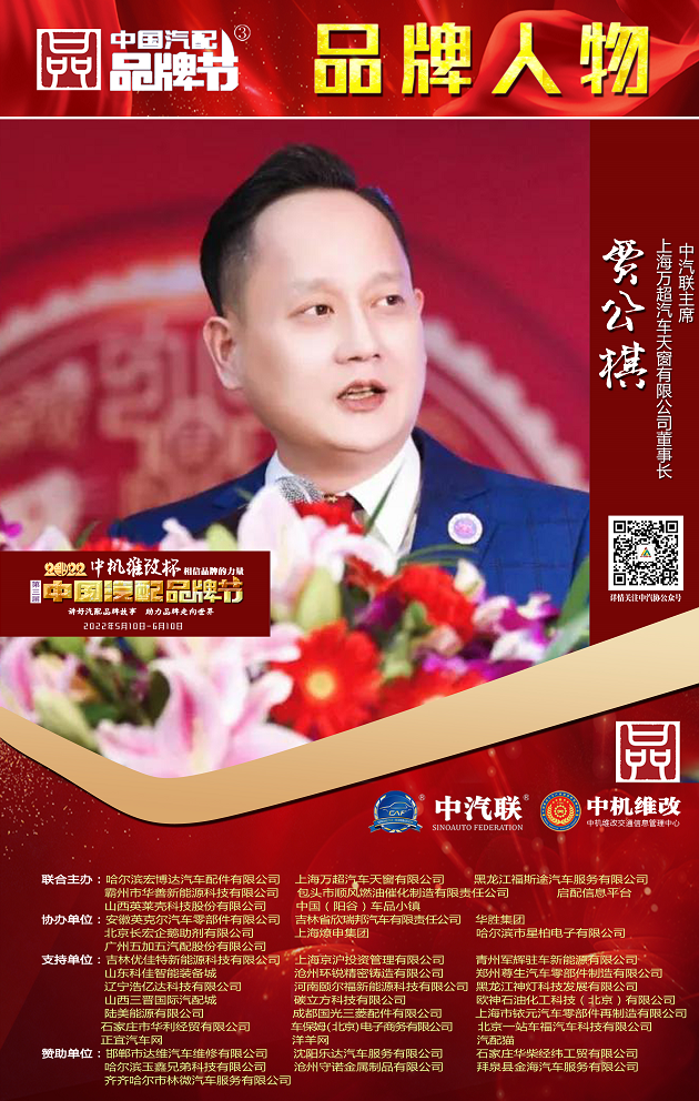 據《2022中國汽配品牌榜》榜單顯示:中汽聯主席、萬超集團董事長賈公棋榮膺“2022中國汽配行業杰出品牌人物”大獎