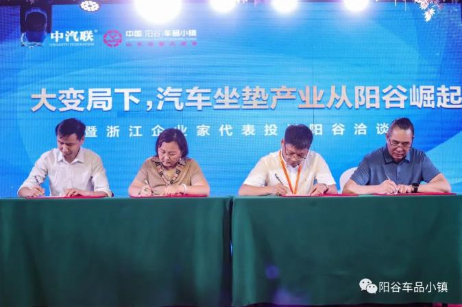 6月29日下午,“大變局下,汽車坐墊產業從陽谷崛起暨浙江企業家代表投資陽谷洽談會”在陽谷獅子樓大酒店隆重召開。來自浙江的應天汽車內飾設計有限公司董事長 張衡、杭州車酷網絡科技有限公司董事長 張興武、磬程科技董事長 徐忠培、寧波山泰紡織品有限公司總經理 施裕鋒、浙江致豐布藝總經理 楊海洋等八位企業家與經濟開發區黨委書記、管委會主任盧加廣、安樂鎮黨委書記王太敬、中國銀行陽谷支行行長 張勇和招商局、陽谷縣民營經濟發展服務中心 、安樂鎮領導;陽谷汽車用品行業協會會長 張平;陽谷車品小鎮發展有限公司董事局主席 蔣克林、董事局副主席 張洪、公司總裁 吳志平及陽谷汽車用品行業廠家代表近100人參會,共同見證這一榮耀時刻。投資洽談會由安樂鎮常務副鎮長孫希洋主持。