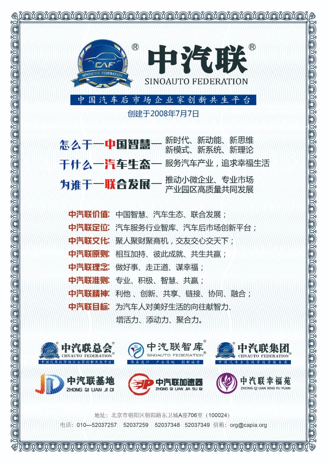中汽聯將打造成為“行業平臺+專家智庫+產業資本+項目孵化+賦能加速”的創新型共生系統,是具有共同價值觀、以對汽車人對美好生活的向往增活力、添動力、聚合力為目標的幸福企業家協作平臺,是企業發展的創新孵化和加速系統,構建新形勢下中國汽車服務業創新型共生平臺,為實現汽車人的中國夢貢獻中汽聯力量。