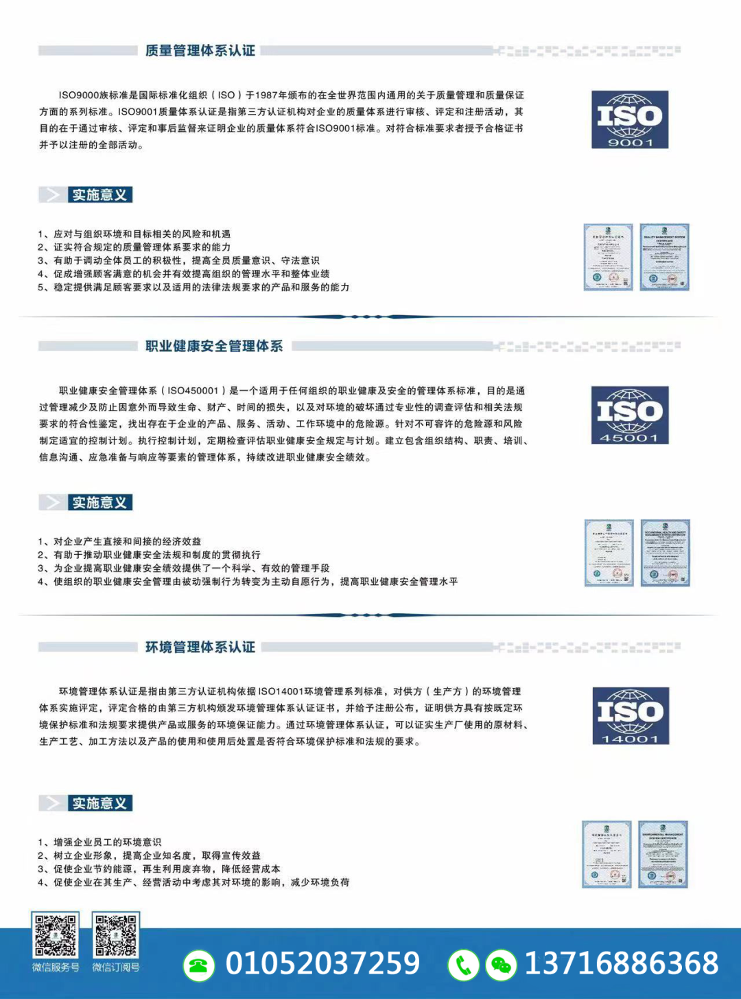 放心聯合認證中心(北京)有限公司經過多年的努力,取得了長足的發展,目前已經具備質量、環境、職業健康安全、汽車救援服務認證、品牌認證、企業誠信認證等多體系認證資質和能力,本中心基于過程和管理的系統方法,通過創新和優化認證程序,全面提高企業的質量、環境、職業健康安全管理水平、服務能力以及產品質量、企業信譽的提升,最終達到組織整體績效的持續改進。