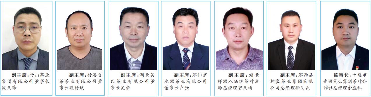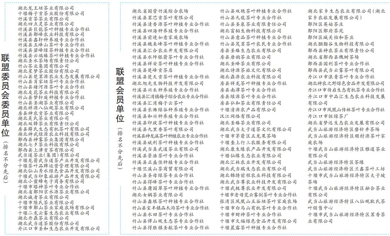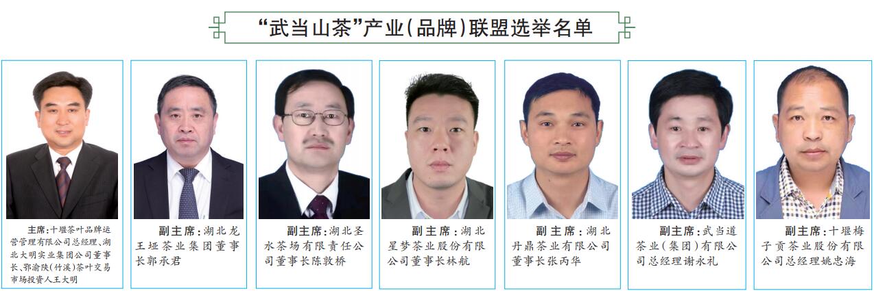 依據聯盟章程,136家會員單位選舉產生了武當山茶產業(品牌)聯盟主席、副主席、委員會委員、監事長、監事。其中,十堰茶葉品牌運營管理有限公司總經理、湖北大明實業集團公司董事長、鄂渝陜(竹溪)茶葉交易市場投資人王大明全票當選為聯盟主席;湖北龍王埡茶業集團董事長郭承君、湖北圣水茶場有限責任公司董事長陳敦橋、湖北星夢茶業股份有限公司董事長林航、湖北丹鼎茶業有限公司董事長張丙華、武當道茶業(集團)有限公司總經理謝永禮、十堰梅子貢茶業股份有限公司總經理姚忠海、竹山茶業集團有限公司董事長沈義鋒、竹溪貢茶茶業有限公司董事長段傳斌、湖北吳氏茶業有限公司董事長吳豪、鄖陽京水源茶業有限公司董事長盧強、湖北祥源八仙觀茶葉總場總經理曾義均、鄖西縣神霧茶業集團有限公司總經理徐明兵當選為聯盟副主席;十堰市老母荒云霧劍茶葉合作社總經理余盛林當選為聯盟監事長。