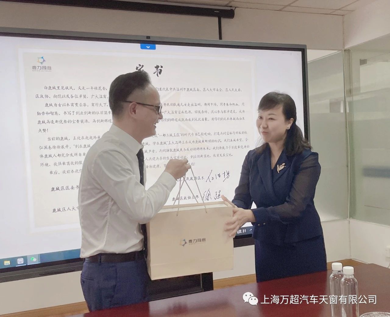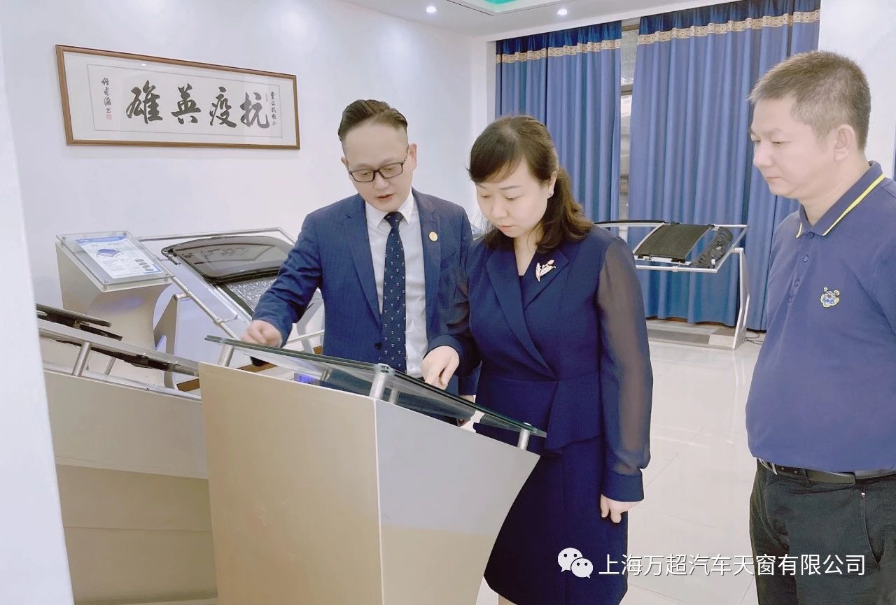 2021年9月9日上午,溫州市鹿城區(qū)委常委、區(qū)委統(tǒng)戰(zhàn)部部長陳軍蘋、區(qū)委統(tǒng)戰(zhàn)部常務(wù)副部長鄒本篤、區(qū)委統(tǒng)戰(zhàn)部副部長、區(qū)橋辦主任謝璇、區(qū)委統(tǒng)戰(zhàn)部工作人員郭超、葉瑋倩等領(lǐng)導(dǎo)一行蒞臨上海萬超汽車天窗有限公司指導(dǎo)工作,上海萬超汽車天窗有限公司董事長賈公棋接待了來賓,對溫州市鹿城區(qū)委統(tǒng)戰(zhàn)部陳軍蘋部長一行的來訪表示熱烈歡迎。相關(guān)部門負(fù)責(zé)人陪同參加。