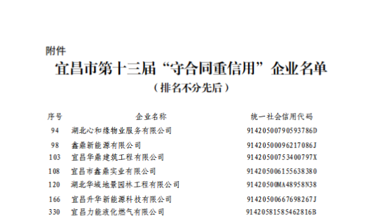 7月11日,宜昌市市場監督管理局印發《關于公布宜昌市第十三屆“守合同重信用”企業的通知》,鑫鼎集團旗下7家公司被評為宜昌市第十三屆“守合同重信用”企業:
