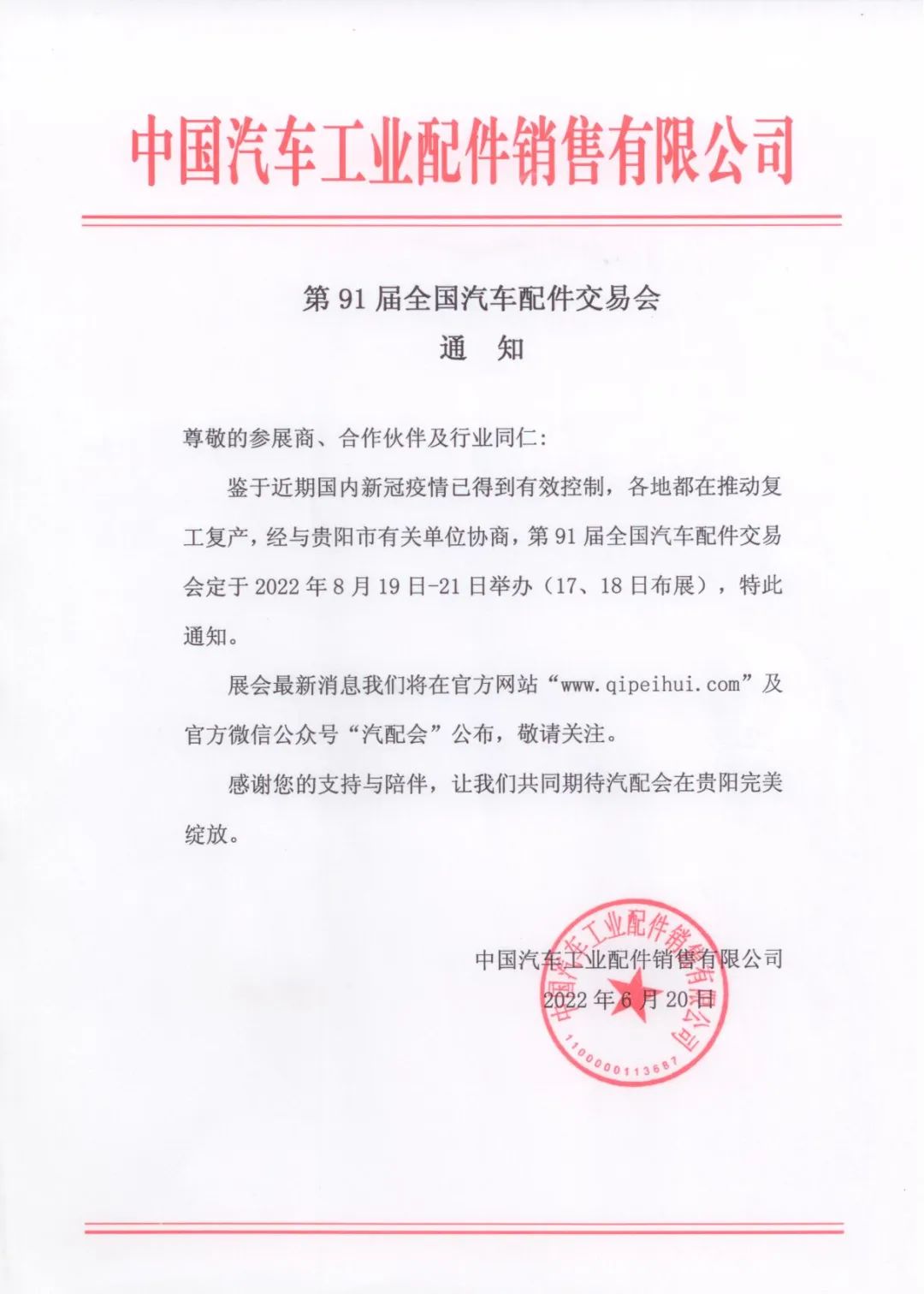 第91屆全國(guó)汽配會(huì)將于8月19-21日貴陽(yáng)舉行