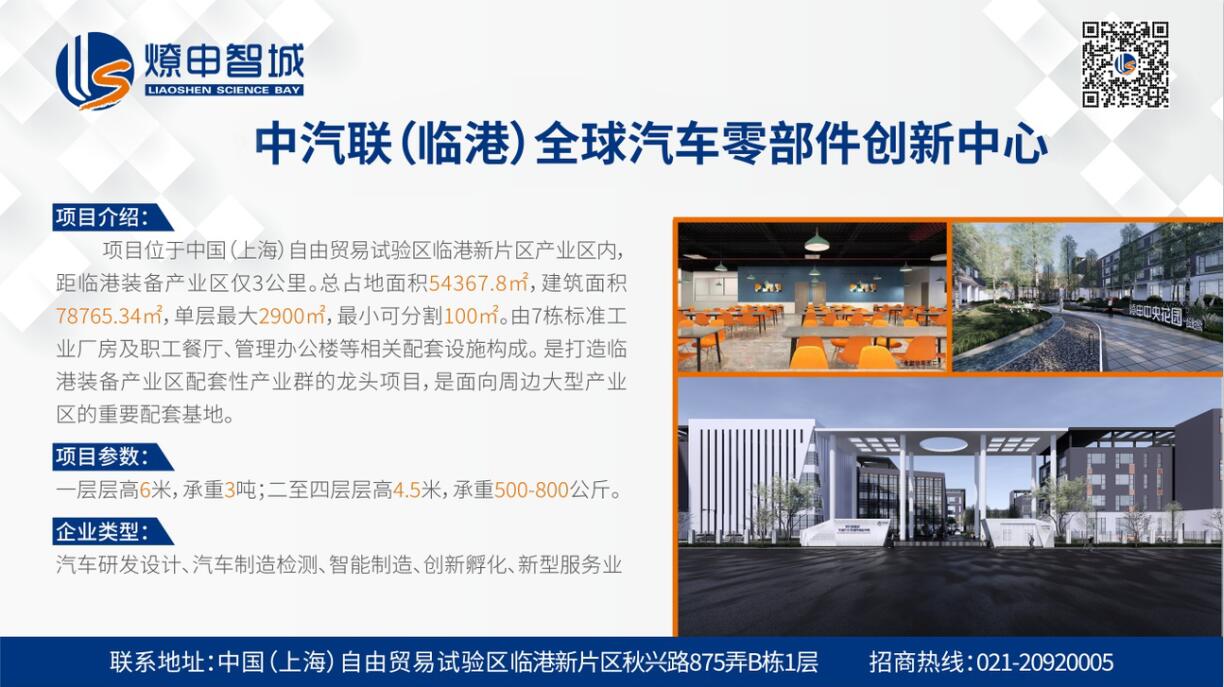 中汽聯(臨港)全球汽車零部件創新中心由燎申集團與中汽聯聯合打造,位于臨港泥城產業區內,屬現代化標準型廠房,距臨港裝備產業區僅3公里。項目總建筑面積15萬平方米,是打造臨港裝備產業區配套性產業群的重要項目。
