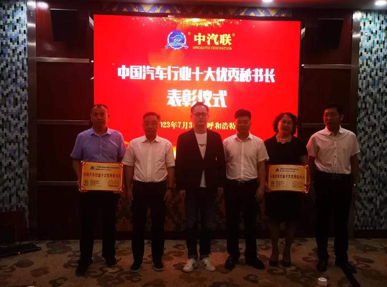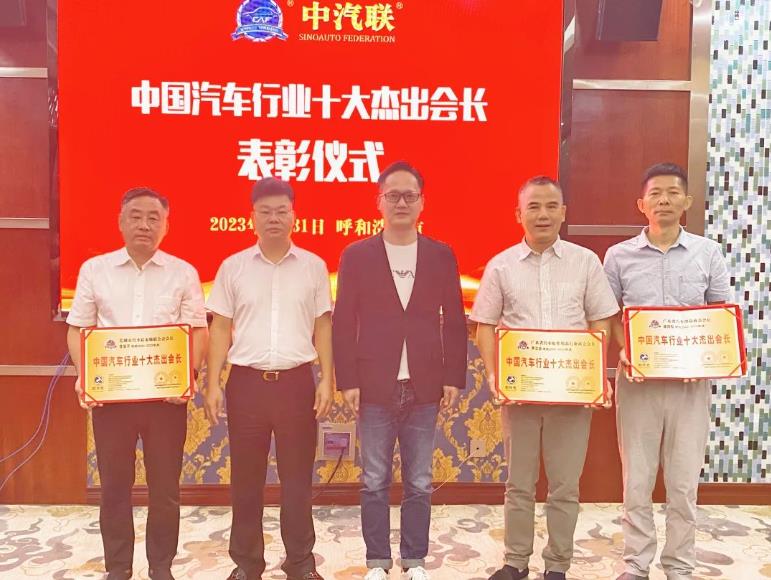 會上,中汽聯主席賈公棋、中汽聯副主席、內蒙古汽車行業協會會長謝友興共同為廣東省汽車用品商會會長潘勁松、蕪湖市汽車后市場聯合會會長曾亞平、廣東省汽車配件用品行業商會會長李立全頒授“2022-2023年度中國汽車行業十大杰出會長”證書;為內蒙古汽車行業協會秘書長趙宏、廣東省汽車配件用品行業商會秘書長朱偉峰頒授“2022-2023年度中國汽車行業十大優秀秘書長 ”證書。