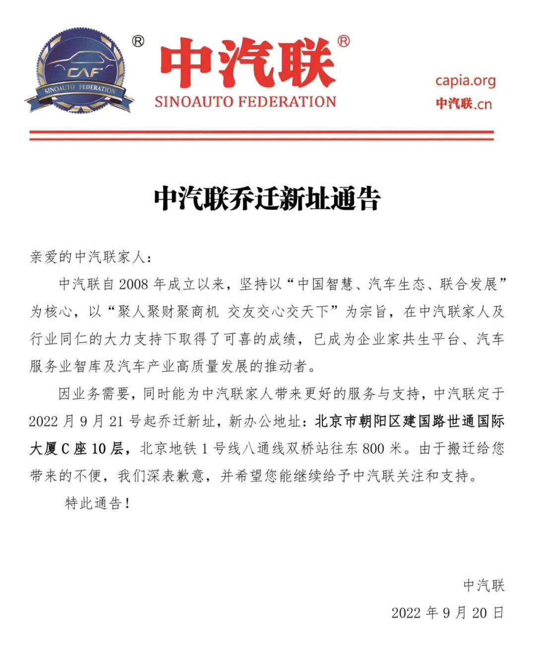 因業(yè)務(wù)需要,同時能為中汽聯(lián)家人帶來更好的服務(wù)與支持,中汽聯(lián)定于2022月9月21號起喬遷新址,新辦公地址:北京市朝陽區(qū)建國路世通國際大廈C座10層,北京地鐵1號線八通線雙橋站往東800米。由于搬遷給您帶來的不便,我們深表歉意,并希望您能繼續(xù)給予中汽聯(lián)關(guān)注和支持。