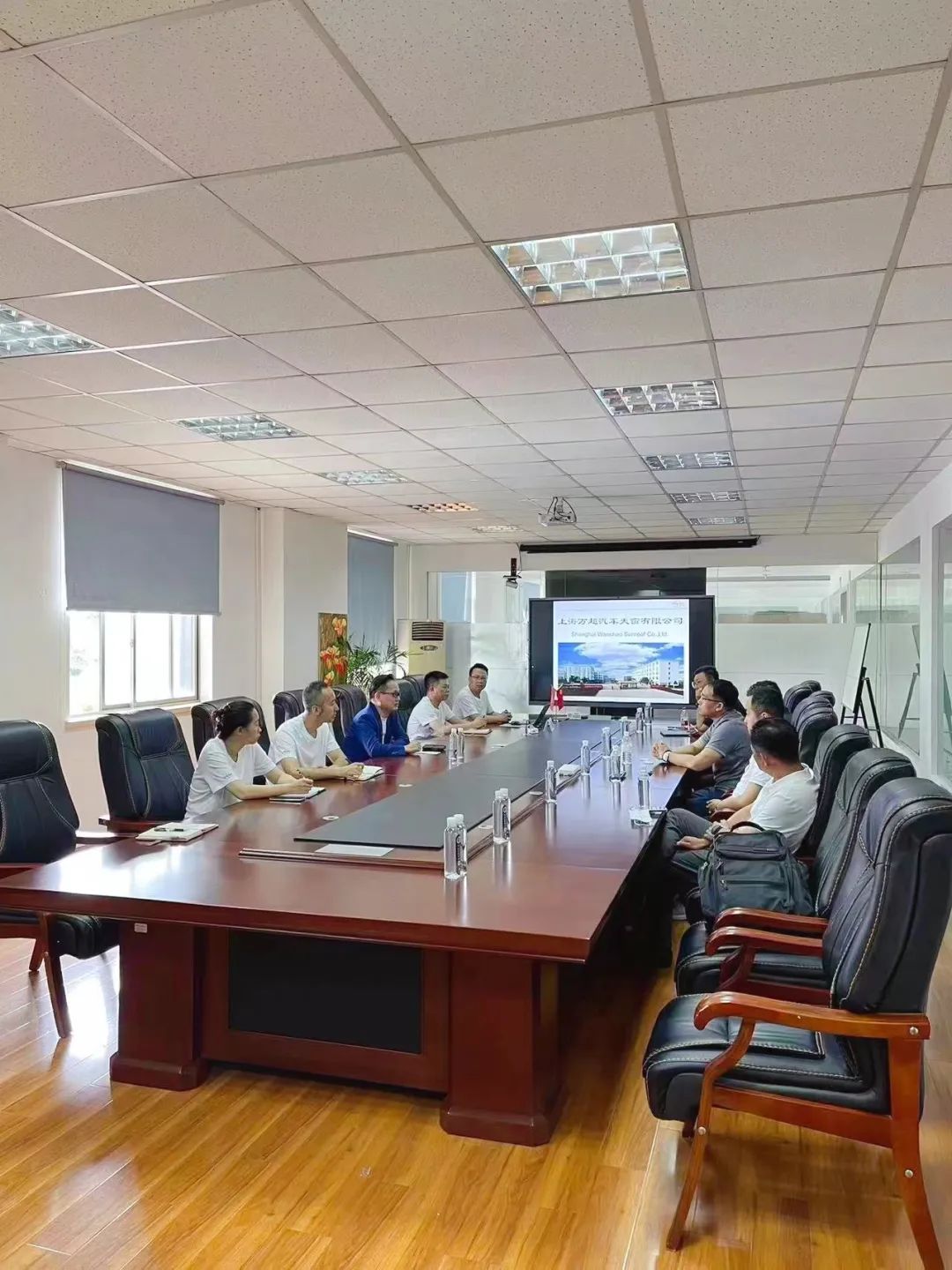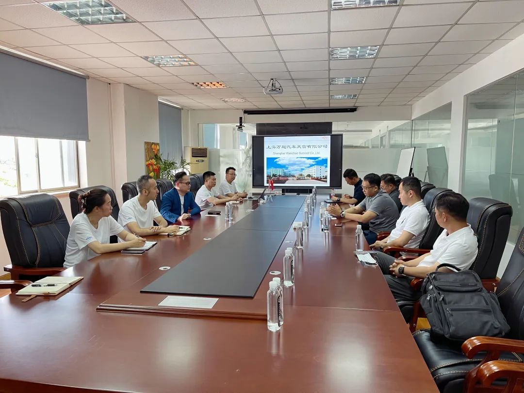 2023年6月13日,中汽聯主席、商務部中國汽車服務業委員會副會長、上海萬超汽車天窗有限公司董事長賈公棋在萬超集團總部會議室親切會見了悅信物流(天津)股份有限公司董事長張勇、副總裁穆青,天津東疆發展集團負責供應鏈金融服務的總經理田磊一行,雙方就汽車產業高質量發展、如何協作創新等方面進行了交流座談。
