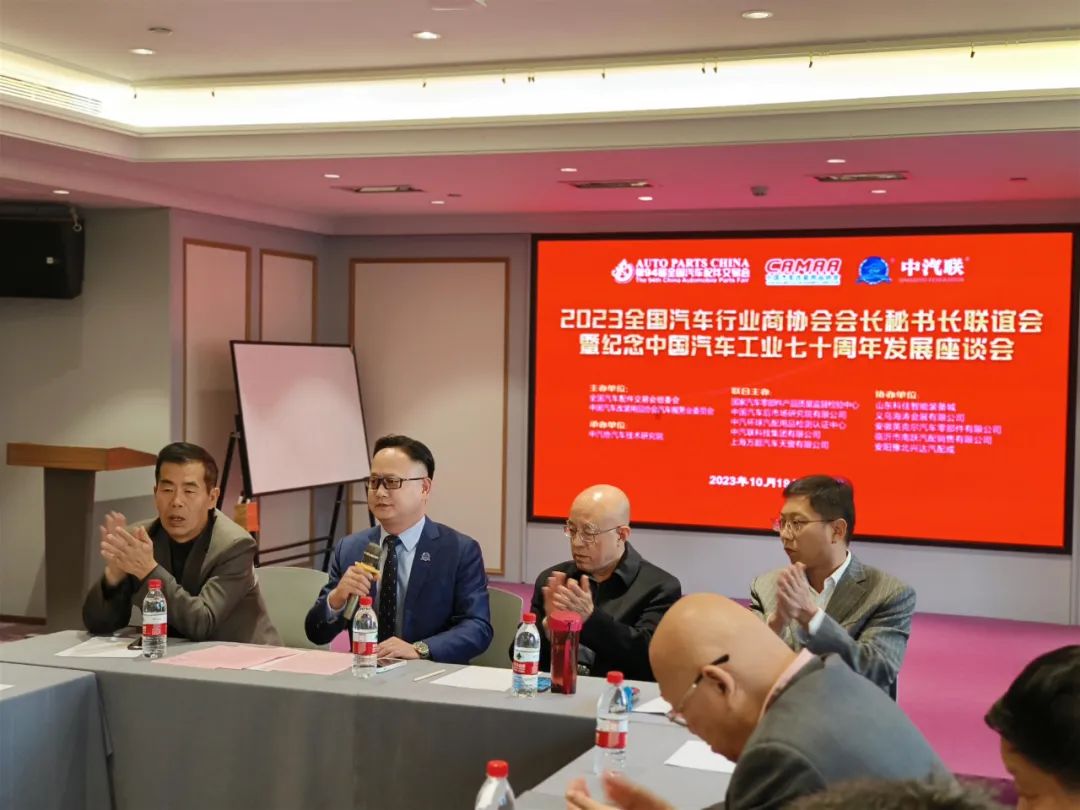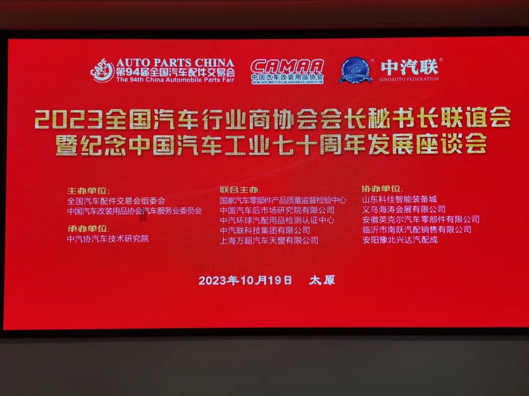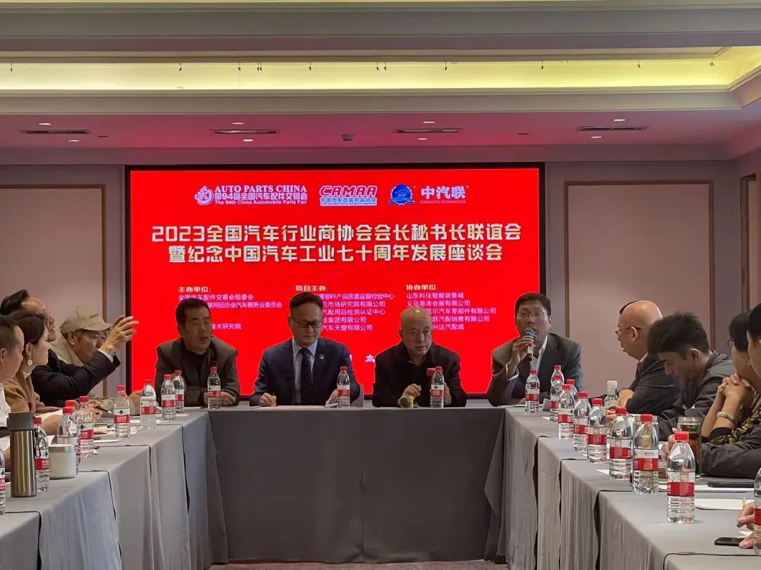 2023全國汽車行業商協會會長秘書長聯誼會暨紀念中國汽車工業七十周年發展座談會由中汽聯發起,中國汽車改裝用品協會汽車服務業委員會、全國汽車配件交易會組委會主辦,國家汽車零部件產品質量監督檢驗中心、中國汽車后市場研究院、上海萬超汽車天窗有限公司、北京中汽聯科技集團聯合主辦,中汽環球汽配用品檢測認證中心、山東科佳智能裝備城、義烏海濤會展有限公司、安徽英克爾汽車零部件有限公司、安陽豫北興達汽配城、臨沂市南躍汽配銷售有限公司友情協辦,中汽協汽車技術研究院承辦。