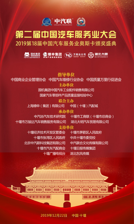 2019第二屆中國汽車服務業大會將包括“中國(十堰)汽車汽配產業高質量發展論壇”、“中國汽車服務業領袖峰會”、“新中國成立70年 汽車服務業70人”功勛人物表彰大會、“第18屆中國汽車服務業奧斯卡頒獎盛典”、“十堰汽車汽配產業招商推介會”、“全國企業家考察東風小康等十堰重點企業”、“第87屆全國汽車配件交易會十堰推介會”、“第二屆中國汽車服務業大會千人晚宴”及“中國(十堰)汽配城成立成立20周年慶祝大會”等系列活動,旨在整合行業資源、倡導原創新銳、活躍汽車文化,推進我國汽車服務業可持續健康發展;并將集中表彰汽車服務業在發展歷程中做出貢獻的功勛人物,向中華人民共和國成立70周年獻禮!