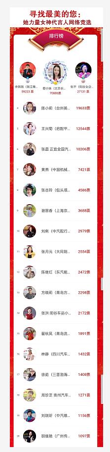 總訪數(shù)超過276100人次,總投票數(shù)達到288066票,受到了汽車行業(yè)企業(yè)家們的廣泛關(guān)注與積極參與,在汽車行業(yè)掀起了一股木蘭熱潮,紛紛為自己心中的木蘭榜樣投票。