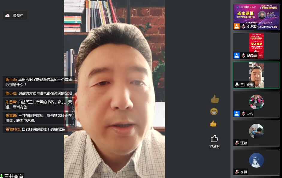 白老師介紹了三井財團的戰略布局,控股的豐田公司現金儲備2000億美元,年利潤達200億美元,豐田占了三個賽道(混合動力、燃油、氫能/純電等電動車),是世界上最大的汽車制造公司。并介紹了豐田大戰特斯拉的緣由及背后的故事,油電混合是豐田利潤的主要來源,豐田更多考慮的是控制風險為主。他指出國家發改委中國投資協會新基建委員會攜手中汽聯共同打造,全新的汽車、零部件供應體系,按照黨中央國務院提出的內循環、鏈長制、統一大市場要求,打造有實力的財團體系,凝聚力量,才能做強。