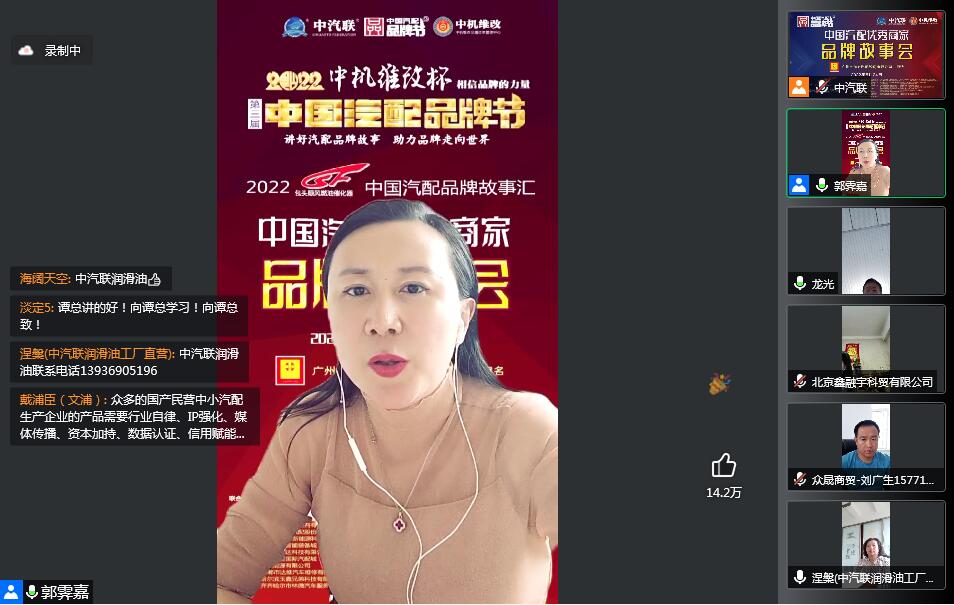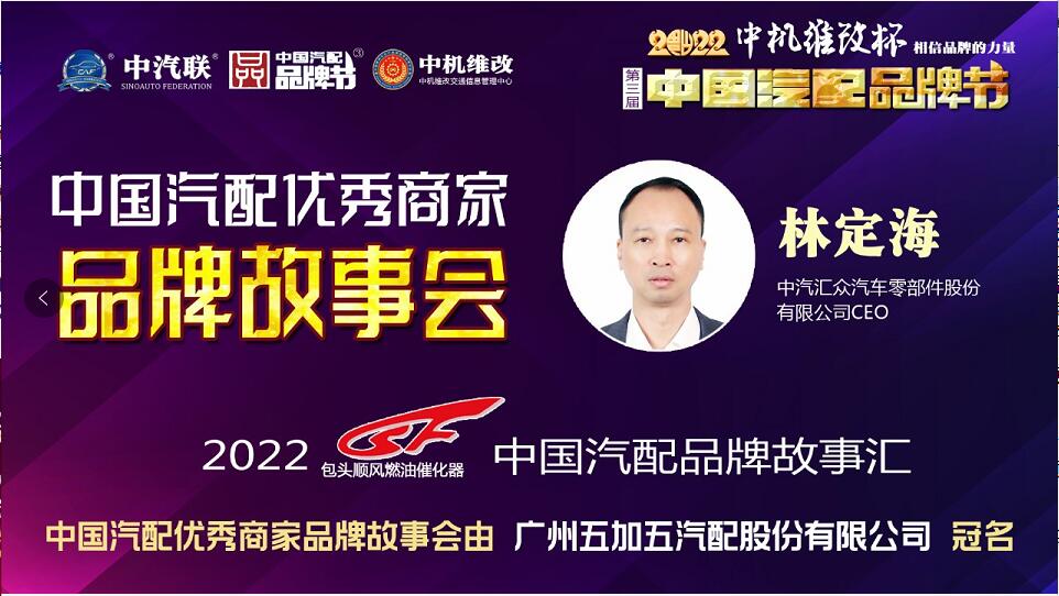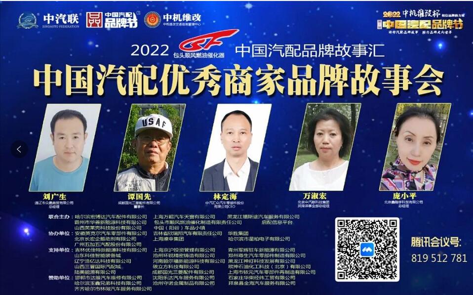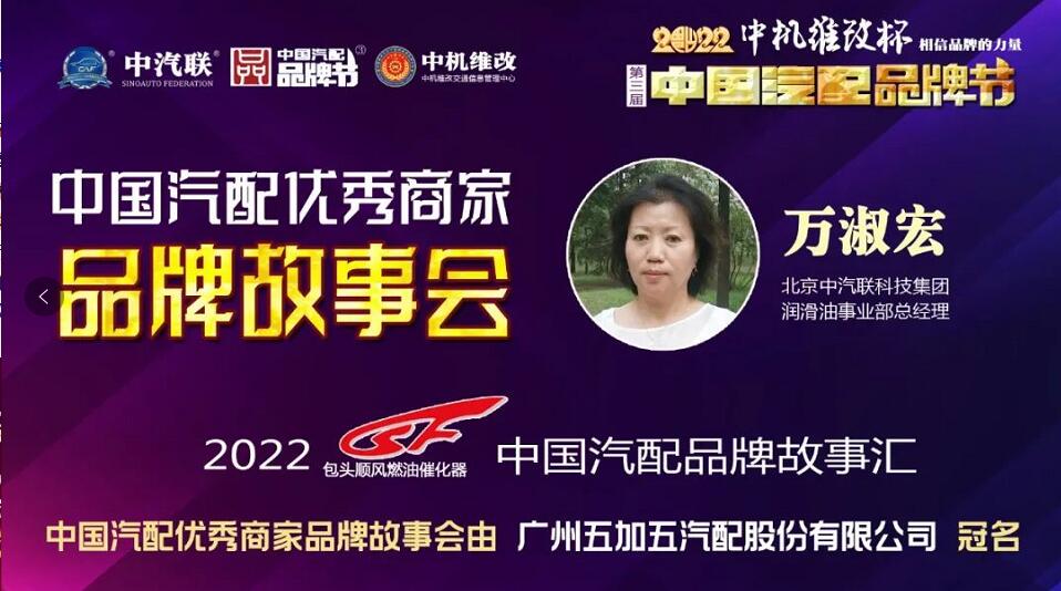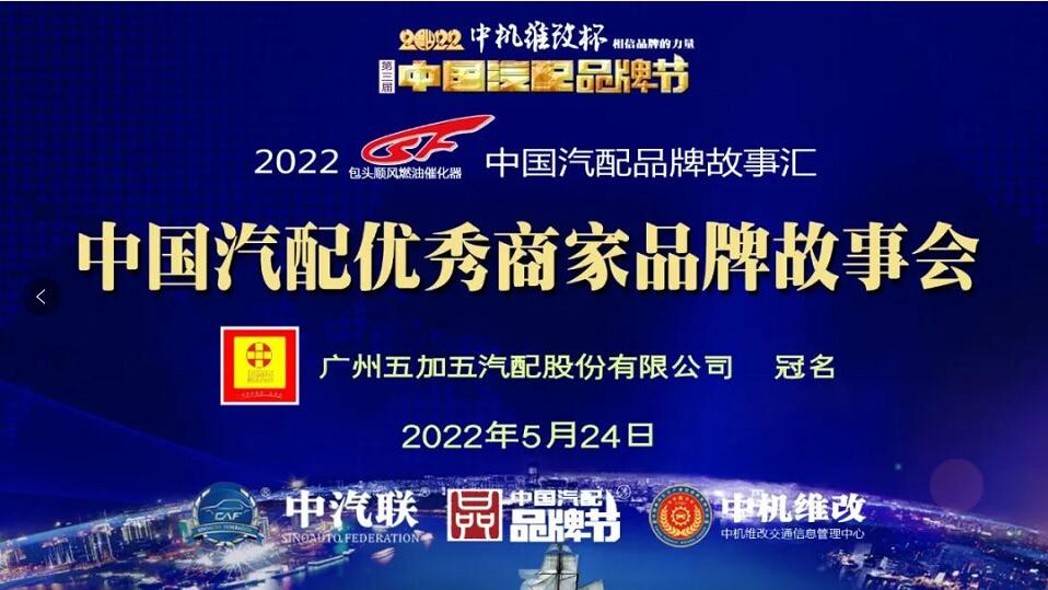 2022年5月24日,“2022 順風燃油催化杯 中國汽配品牌故事匯”的第二場活動,由 廣州五加五汽配股份有限公司 特約冠名播出的“2022中國汽配優秀商家品牌故事會在線上成功召開,通遼市眾晟商貿有限公司總經理劉廣生、成都國光三菱配件有限公司董事長譚國先、中汽匯眾汽車零部件股份有限公司CEO 林定海、北京中汽聯科技集團潤滑油事業部總經理萬淑宏、北京鑫融宇科貿有限公司總經理龐小平 等五位嘉賓做了精彩分享,引起了汽配流通行業從業人員的廣泛關注,點贊達數量達到150000個。2022中國汽配優秀商家品牌故事會由中汽聯秘書長、中國汽配品牌節副主席兼秘書長郭霽嘉主持。