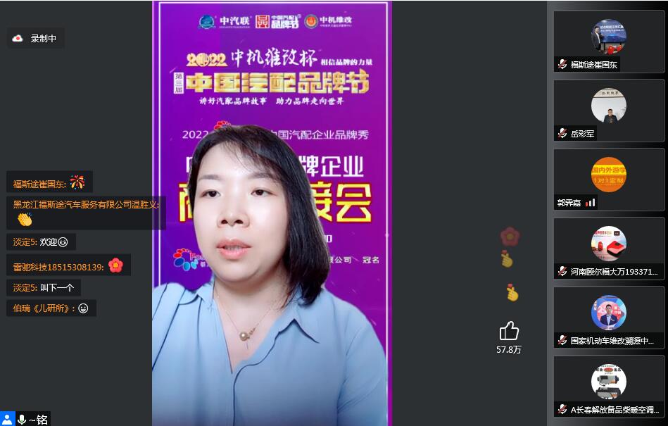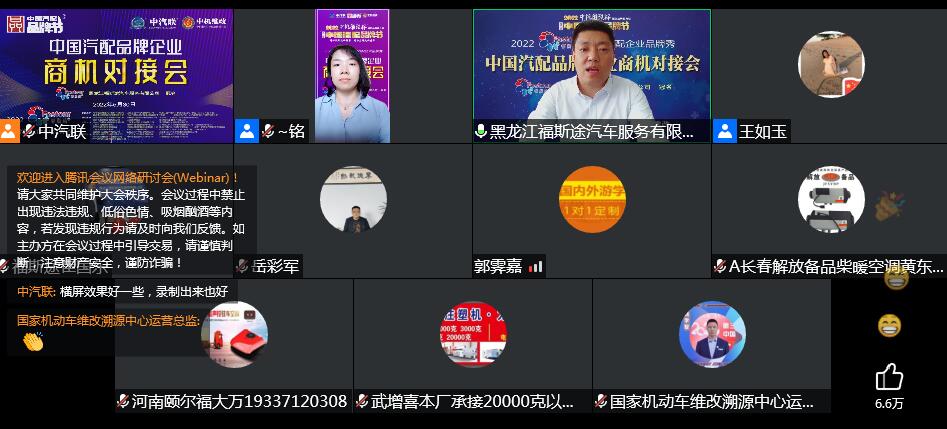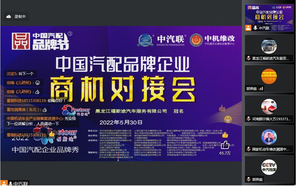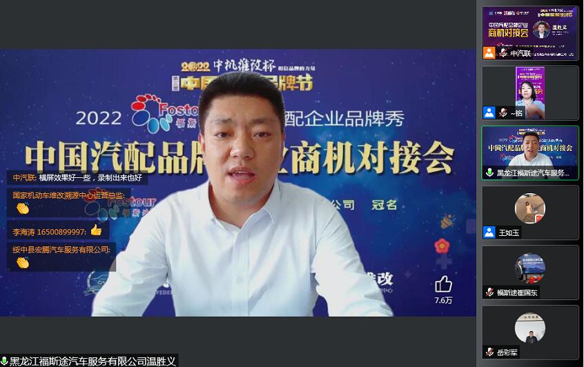 2022年5月30日,“2022 福斯途杯 中國汽配企業品牌秀”的第一場活動,由 黑龍江福斯途汽車服務有限公司 特約冠名播出的2022中國汽配品牌企業商機對接會在線上成功召開,黑龍江福斯途汽車服務有限公司董事長溫勝義、總經理崔國東,河南頤爾福新能源科技有限公司董事長孫紅杰、吉林優佳特新能源科技有限公司董事長黃昭斌、青州軍輝駐車新能源有限公司董事長岳彩軍、霸州市華善新能源科技有限公司董事長武增喜 、滄州環銳精密鑄造有限公司董事長辛鳳茂等嘉賓出席汽配企業品牌秀并做了精彩分享,引起了行業的廣泛關注,點贊數量達到657000個。2022中國汽配品牌企業商機對接會由中汽聯執行秘書長、中國汽配品牌節常務秘書長徐銘主持。