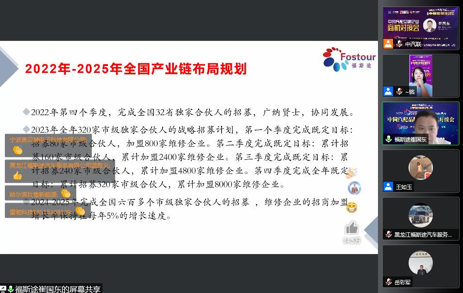 崔總還發布了福斯途2022年-2025年全國產業鏈布局規劃。2022年第四個季度,完成全國32省獨家合伙人的招募,廣納賢士,協同發展。2023年全年320家市級獨家合伙人的戰略招募計劃,第一個季度完成既定目標:招募80家市級合伙人,加盟800家維修企業。第二季度完成既定目標:累計招募160家市級合伙人,累計加盟2400家維修企業。第三季度完成既定目標:累計招募240家市級合伙人,累計加盟4800家維修企業。第四季度完成全年既定目標:累計招募320家市級合伙人,累計加盟8000家維修企業。2024-2025年完成全國六百多個市級獨家合伙人的招募 ,維修企業的招商加盟增長率保持在每年5%的增長速度。