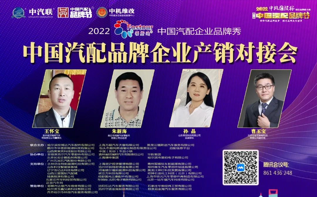 2022中機維改杯中國汽配品牌節由中機維改交通信息管理中心獨家總冠名,由中汽聯、中汽配、中機維改共同主辦;哈爾濱宏博達汽車配件有限公司、上海萬超汽車天窗有限公司、中國(陽谷)車品小鎮、黑龍江福斯途汽車服務有限公司、包頭市順風燃油催化器制造有限責任公司、霸州市華善新能源科技有限公司、啟配信息平臺、山西英萊殼科技股份有限公司聯合主辦;由華勝集團、上海燎申集團、吉林欣瑞邦汽車有限責任公司、安徽英克爾汽車零部件有限公司、北京長宏企鵝助劑有限公司、哈爾濱市星柏電子有限公司、廣州五加五汽配股份有限公司友情協辦;由吉林優佳特新能源科技有限公司、上海京滬投資管理有限公司、青州軍輝駐車新能源有限公司、山東科佳智能裝備城、鄭州尊生汽車零部件制造有限公司、滄州環銳精密鑄造有限公司、遼寧浩億達科技有限公司、河南頤爾福新能源科技有限公司、黑龍江神燈科技發展有限公司、山西三晉國際汽配城、歐神石油化工科技(北京)有限公司、碳立方科技有限公司、陸美能源有限公司、上海市銥元汽車零部件再制造有限公司、成都國光三菱配件有限公司、石家莊市華利經貿有限公司、車保姆(北京)電子商務有限公司、北京一站車福汽車科技有限公司、正宜汽車網、洋羊網 特別支持;邯鄲市達維汽車維修有限公司、沈陽樂達汽車服務有限公司、哈爾濱玉鑫兄弟科技有限公司、滄州守諾金屬制品有限公司、拜泉縣金海汽車服務有限公司、齊齊哈爾市林微汽車服務有限公司、石家莊華柴經緯工貿有限公司 友情贊助;由德州市鑫雙恒汽車服務有限公司、浚縣李春亮汽車維修門市部 、滄州春立汽車服務有限公司、臨沂富裕汽車服務有限公司、綏中縣宏騰汽車服務有限公司、榆樹市鑫運程汽車服務限公司、綏中縣鑫發汽車服務有限公司、臨清市浩航汽車服務有限公司、中能國業(北京)科技有限公司特別祝賀。