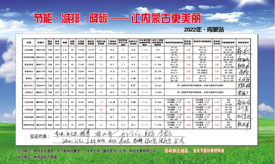 在此背景下,林西縣交通運輸局與中汽聯于7月30日至8月3日期間,聯合舉辦了“節能·減排·降碳 讓內蒙古更美麗 赤峰市林西縣在行動”活動,以測試一款與市場傳統燃油同價的新型燃油增效降碳率,活動期間對11輛不同型號的汽油和柴油車加注新型燃油后進行道路行駛測試,通過測試車輛加注新型燃油與傳統燃油續航里程對比,并在正規檢測機構對車輛尾氣排放綜合指標檢測后得出測試結果。