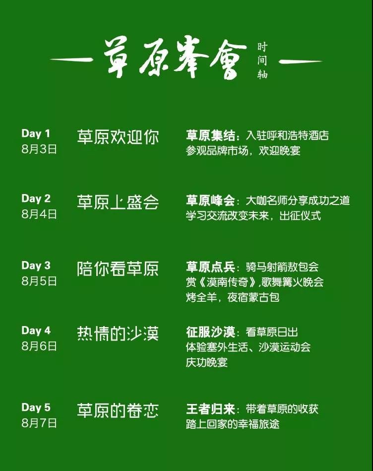 費用包括游學(xué)期間峰會、學(xué)習(xí)、資料、服裝、旅游、考察、戶外拓展、交通、四晚住宿(8月3日、4日、6日雙人四星酒店標(biāo)間,8月5日草原蒙古包)、餐飲等費用。