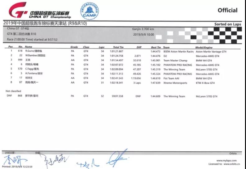 2019 China GT中國超級跑車錦標賽第十回合GT4組成績