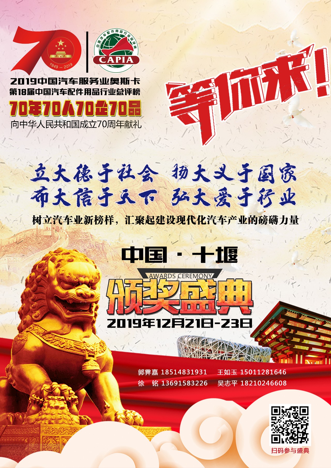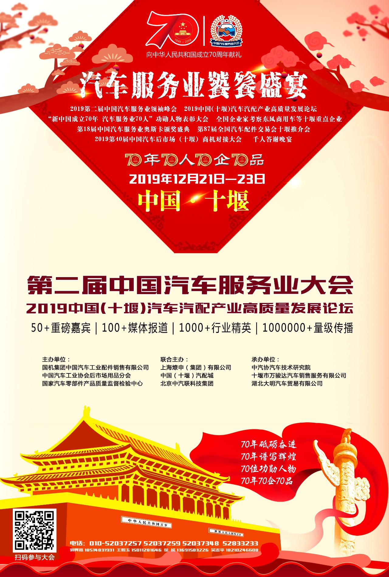 不忘初心,牢記使命。為貫徹落實黨的十九大精神,認真貫徹落實《國務院辦公廳關于加快發展流通促進商業消費的意見》(國辦發〔2019〕42號)和《關于隆重慶祝中華人民共和國成立70周年廣泛組織開展“我和我的祖國”群眾性主題宣傳教育活動的通知》的相關要求,激發和保護企業家精神,壯大企業家隊伍,增強企業家信心,進一步推動經濟新常態下汽車企業加快發展方式轉變,實現高質量發展,舉辦一堂中汽聯“特殊黨課”,擬在十堰市人民政府支持下,由中國汽車工業協會后市場用品分會、國機集團中國汽車工業配件銷售有限公司、國家汽車零部件產品質量監督檢驗中心等機構主辦的以“新時代、新格局、新使命”為主題的2019第二屆中國汽車服務業大會暨中國(十堰)汽車汽配產業高質量發展論壇將于2019年12月21-23日在中國商用車之都、道教圣地湖北十堰市盛大舉行。