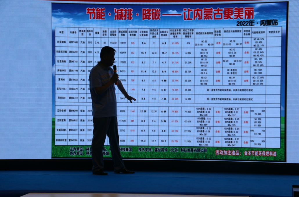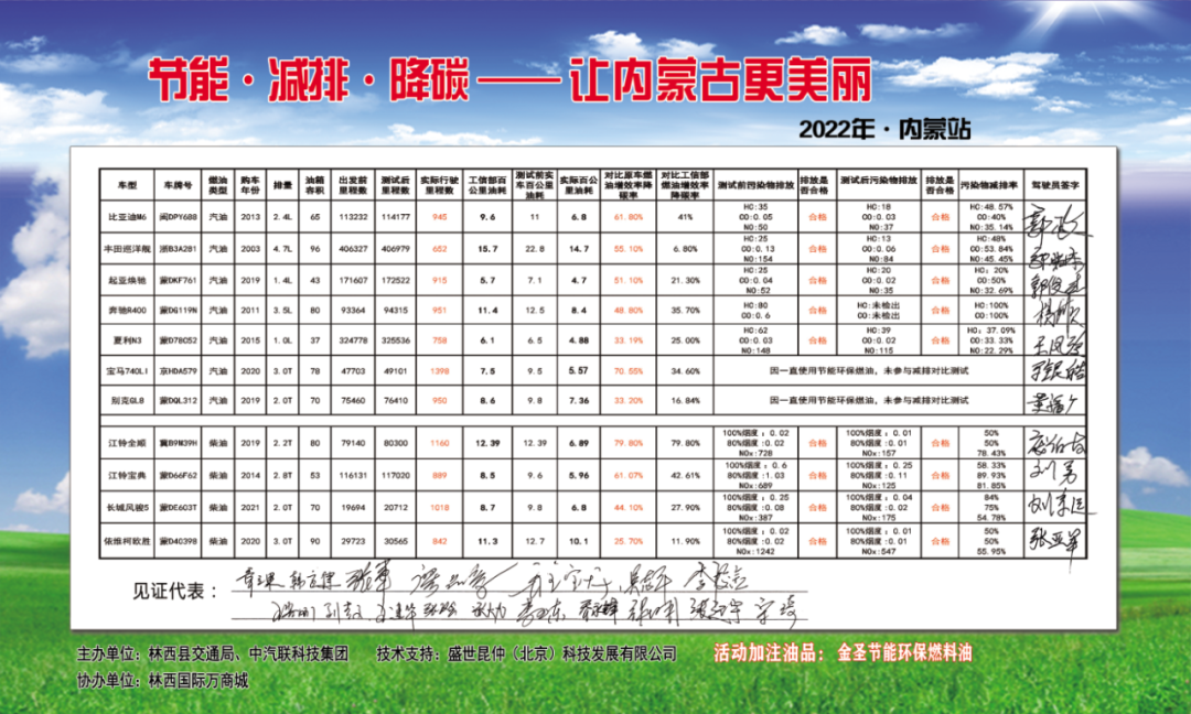 赤峰市林西縣人民政府縣副縣長孟慶輝,林西縣政協副主席、縣交通局局長張明及特邀的沈陽市原副市長宋琦、中國人民武裝警察部隊特種警察學院副院長章立果、原國防科工委質檢中心主任張軍、中華慈善總會副秘書長張潔、國家環保部機動車排污監控中心研究員總工程師韓應健、國家汽車零部件產品質量監督檢驗中心副主任楊貴霖、中機維改交通信息管理中心主任趙幸芝、中汽協汽車技術研究院院長喬永鋒等領導見證“節能·減排·降碳 讓內蒙古更美麗 赤峰市林西縣在行動”活動測試結果,并對金圣節能環保燃油給予高度評價。
