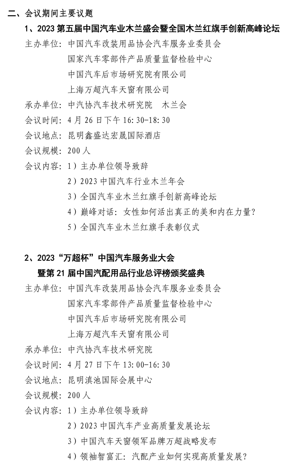 | 13:00-16:30 | 2023“萬超杯”中國汽車服務業大會 暨第21屆中國汽配用品行業總評榜頒獎盛典 |